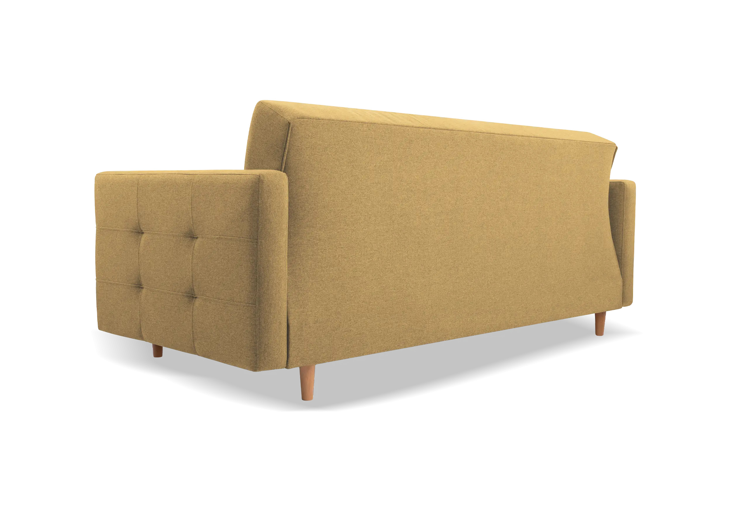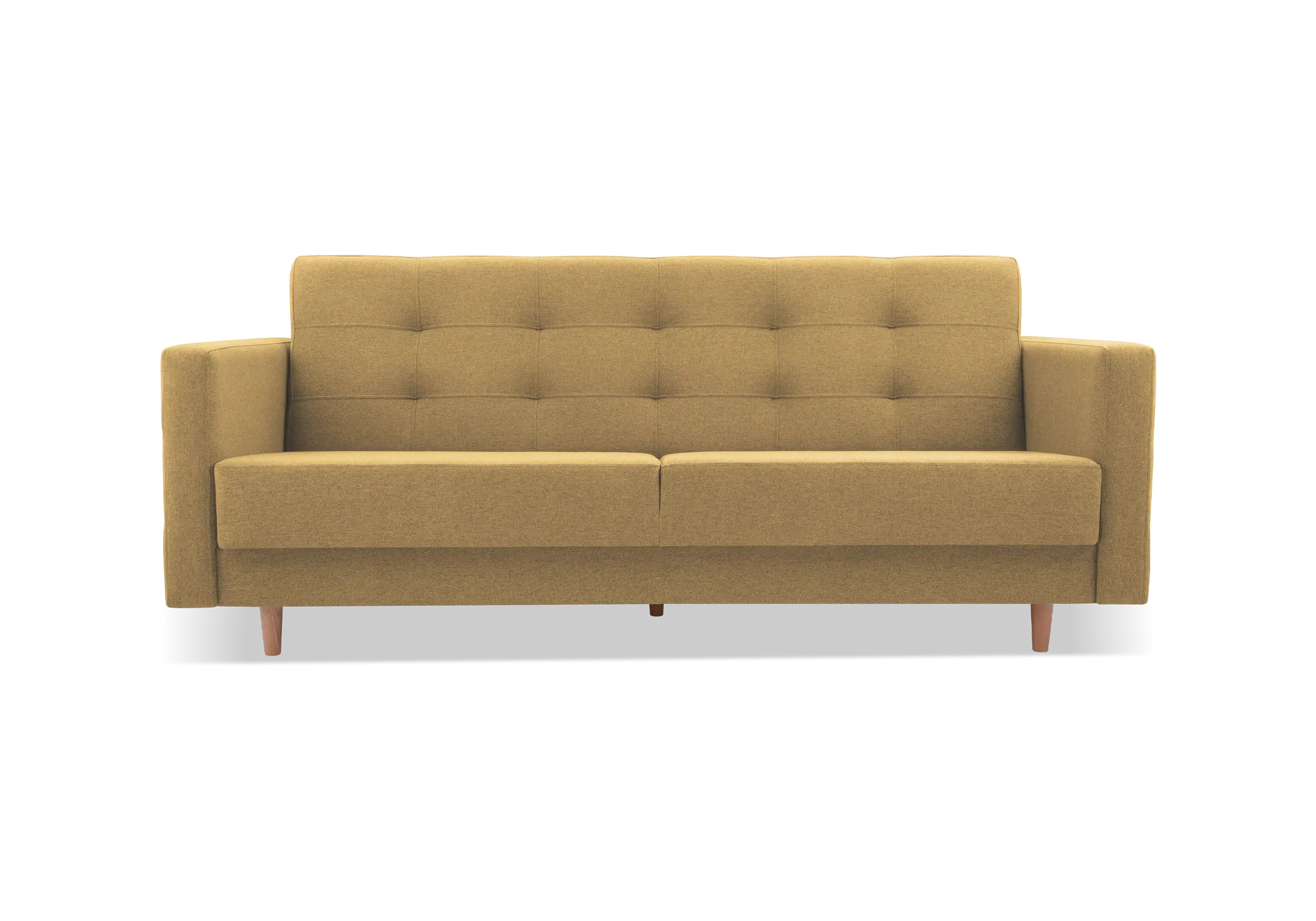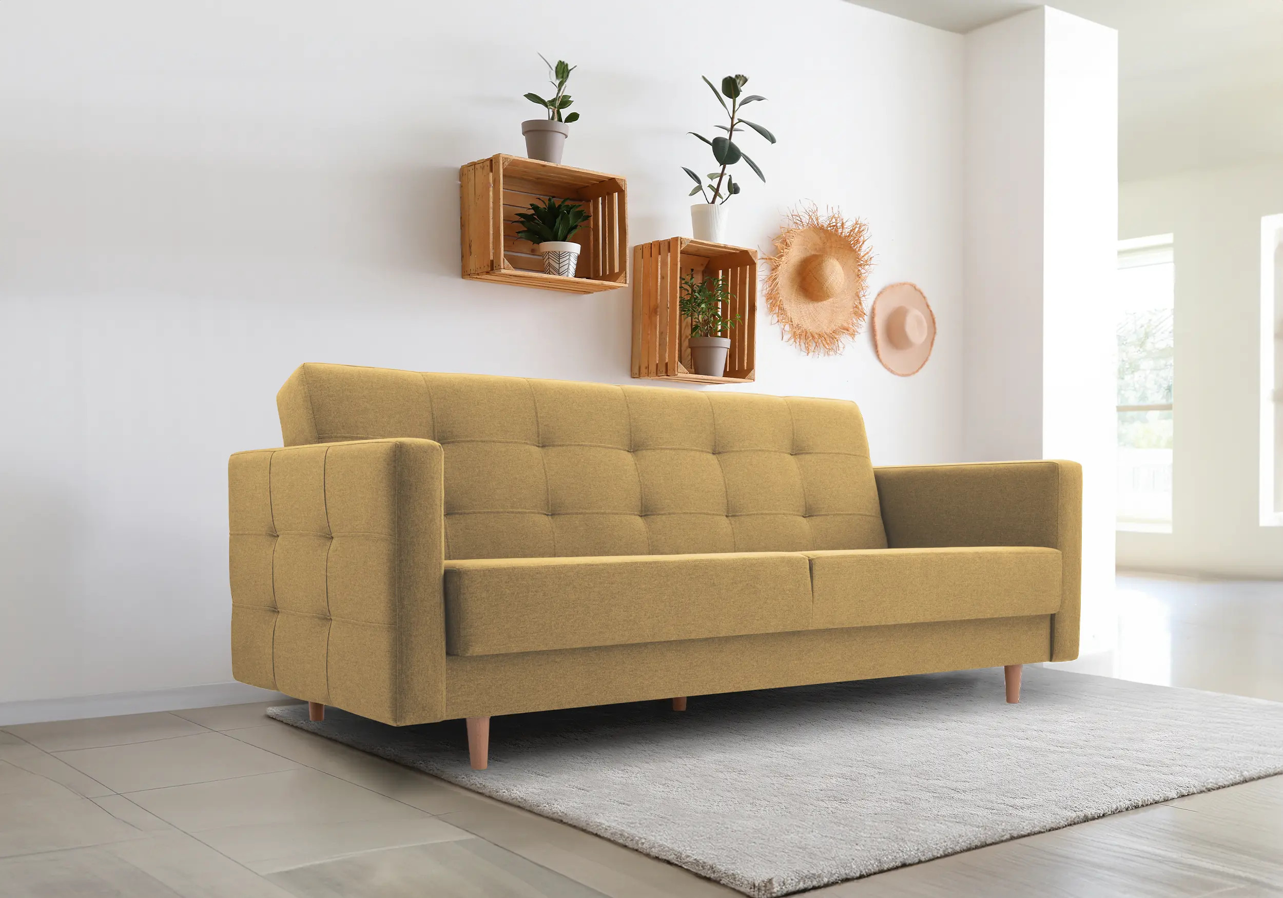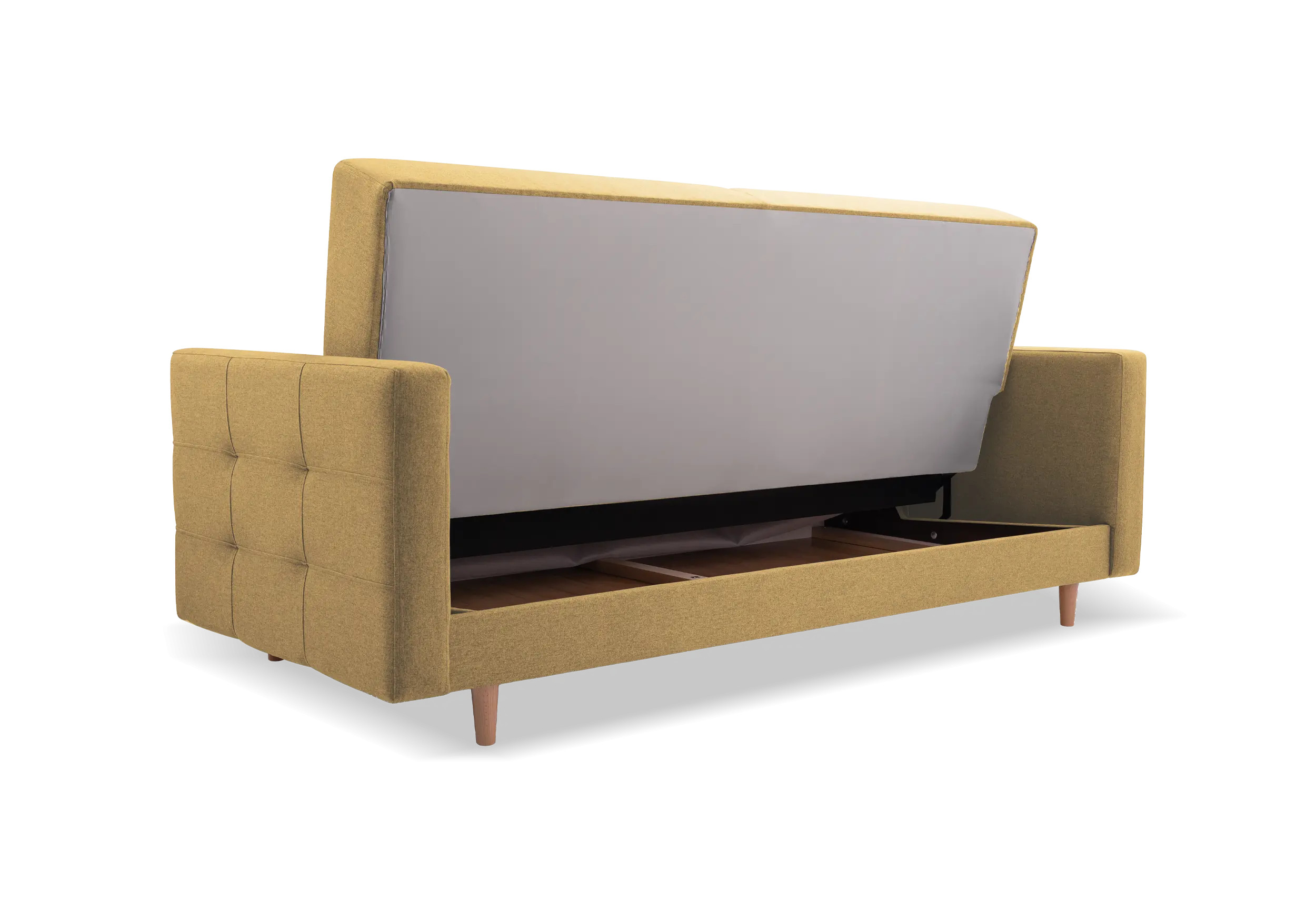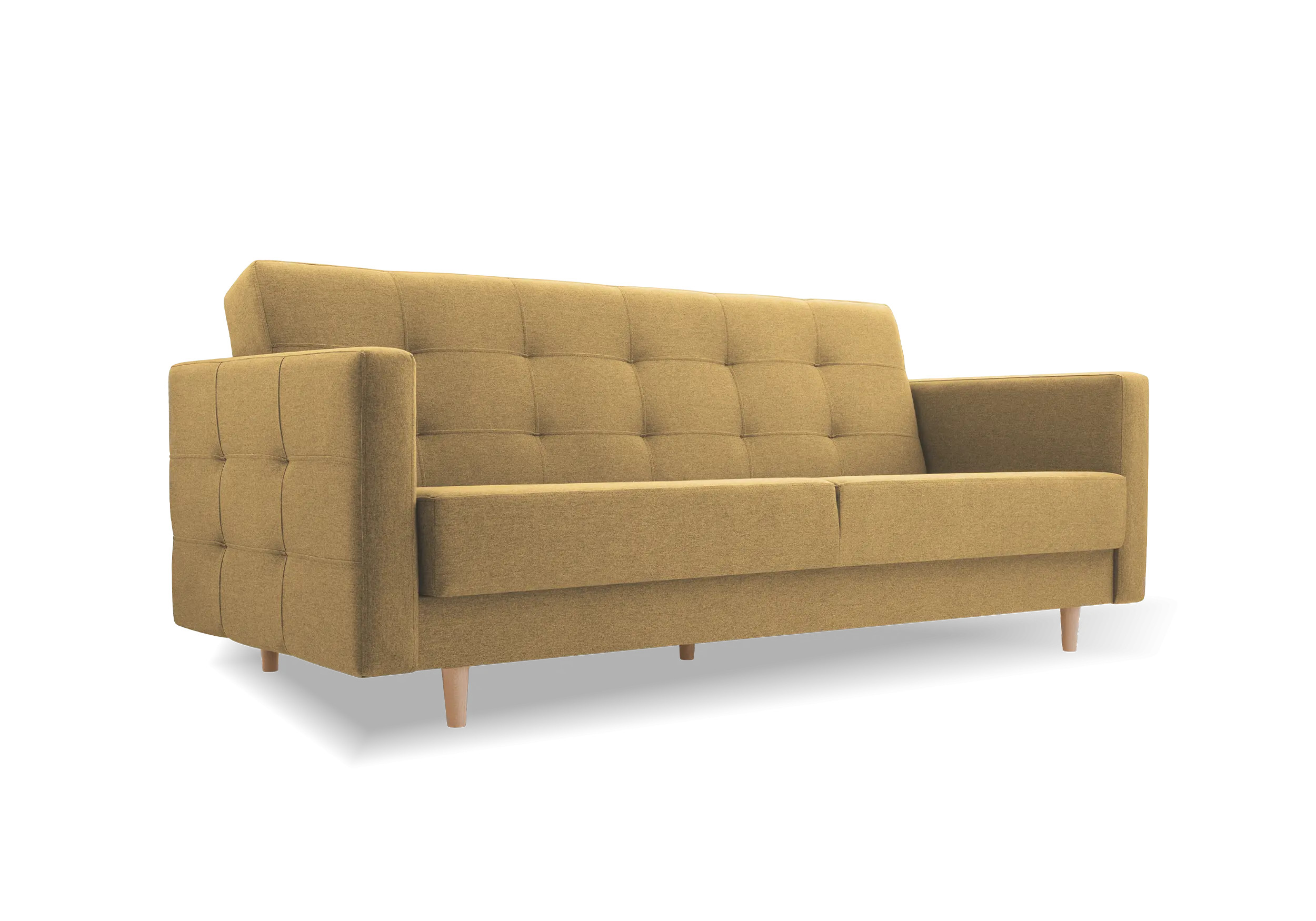 Kanapa Godivo świetnie współgra z wnętrzami urządzonymi w stylu skandynawskim bądź nowoczesnym. Cechą charakterystyczną tej kanapy są drewniane nóżki oraz pikowania na oparciu i boczkach. Kanapa z tyłu obita jest materiałem pod kolor całości, posiada powierzchnię spania 119x180cm oraz pojemnik na pościel.