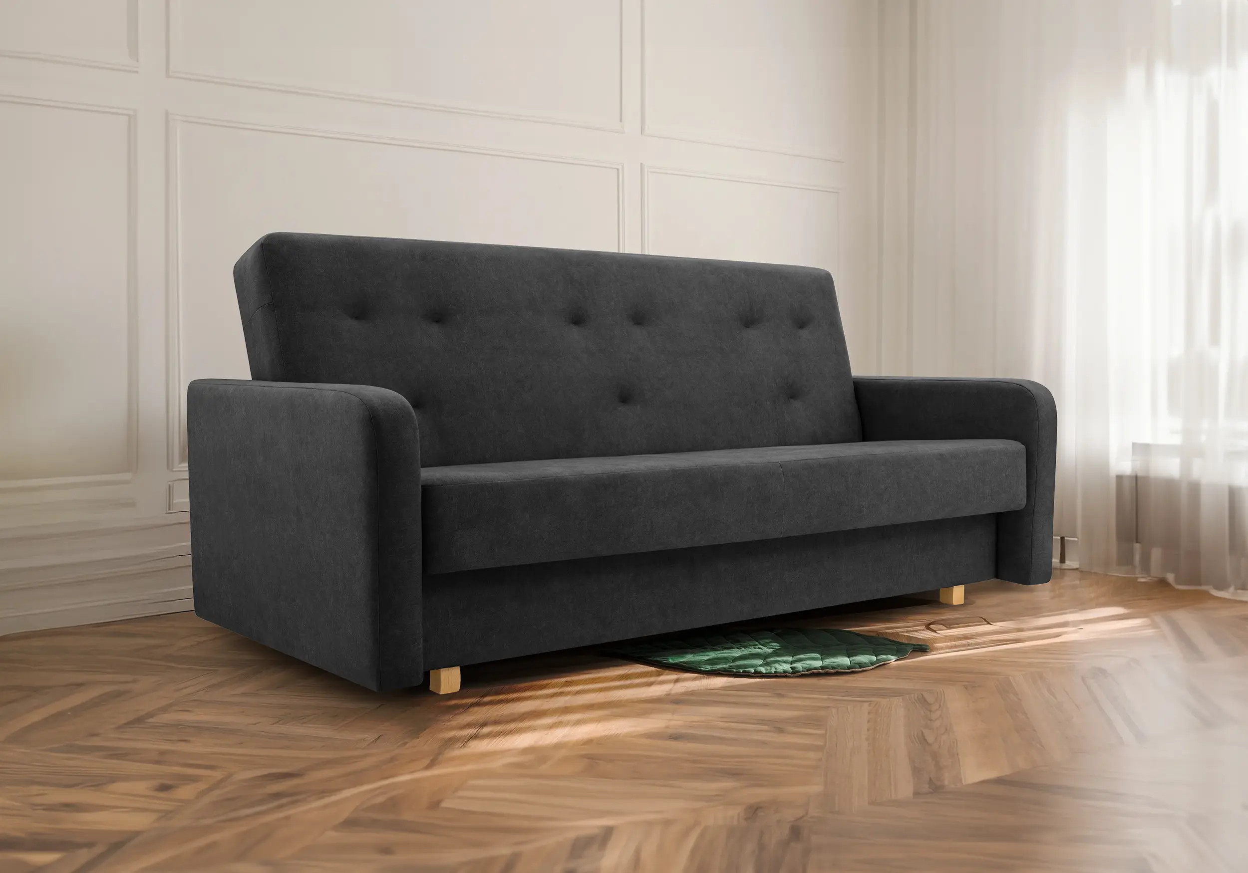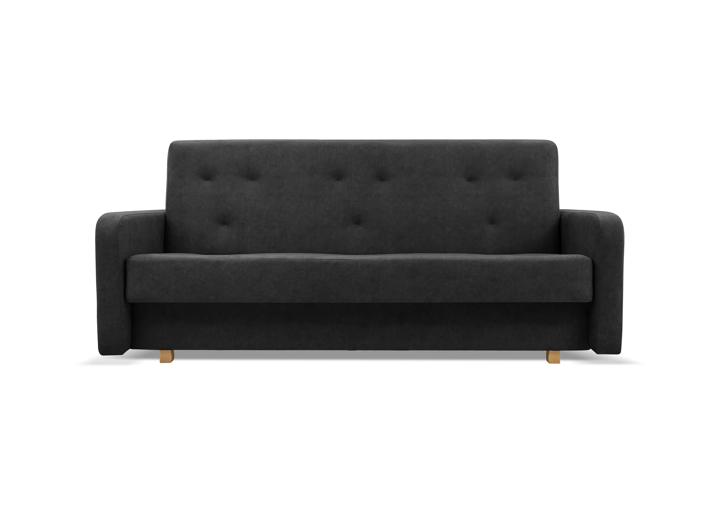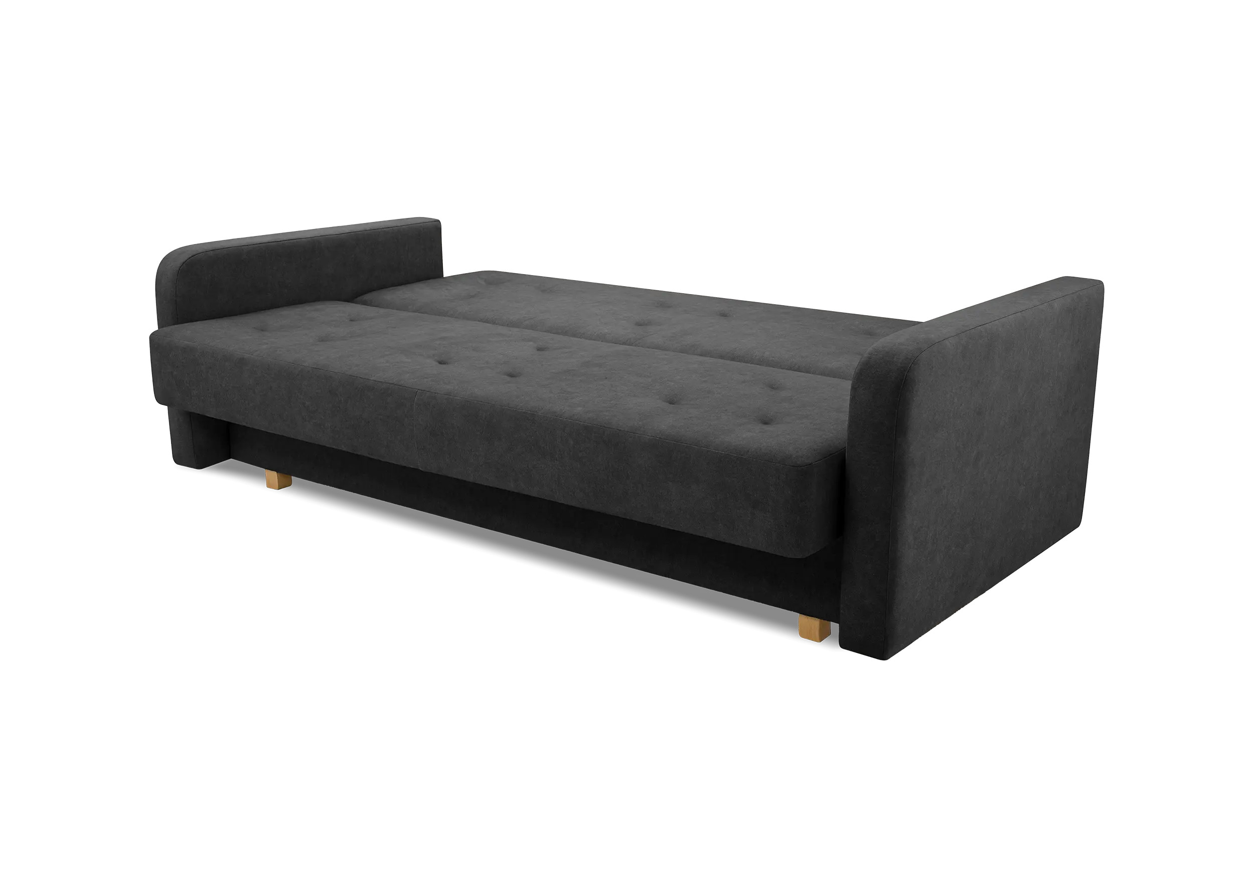 Kanapa rozkładana KASIA to model, który doskonale wpisze się w każde wnętrza. Cechą charakterystyczną sofy, jest uniwersalny styl pasujący dla klasycznych jak i nowoczesnych wnętrz. Dekoracyjne wciągnięcia na oparciu doskonale komponuje się z prostą formą kanapy. Delikatne nóżki w kolorze drewna. Wersalka posiada funkcję spania. Po rozłożeniu jej powierzchnia spania osiąga 181×120 cm. W skrzyni mebla znajduje się pojemnik na pościel, w którym możesz przechować zapasową pościel lub koce.