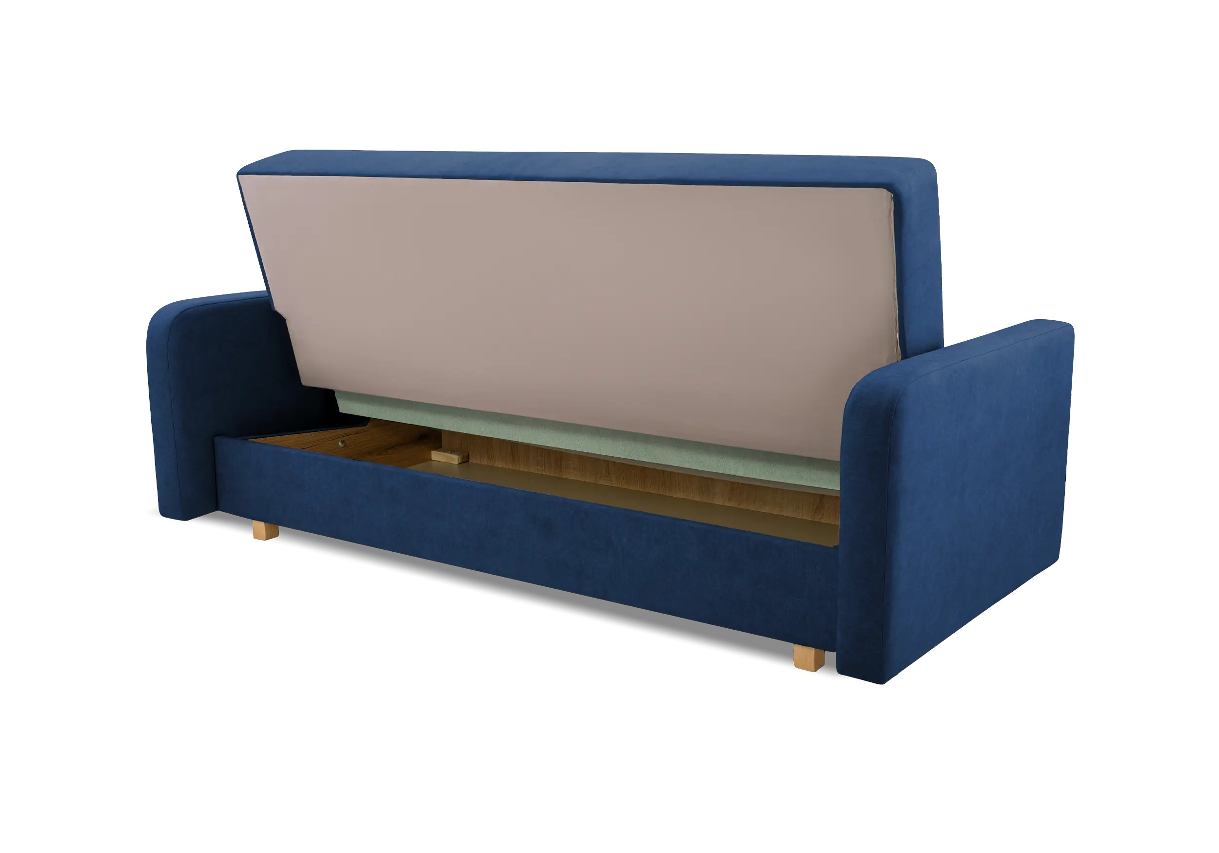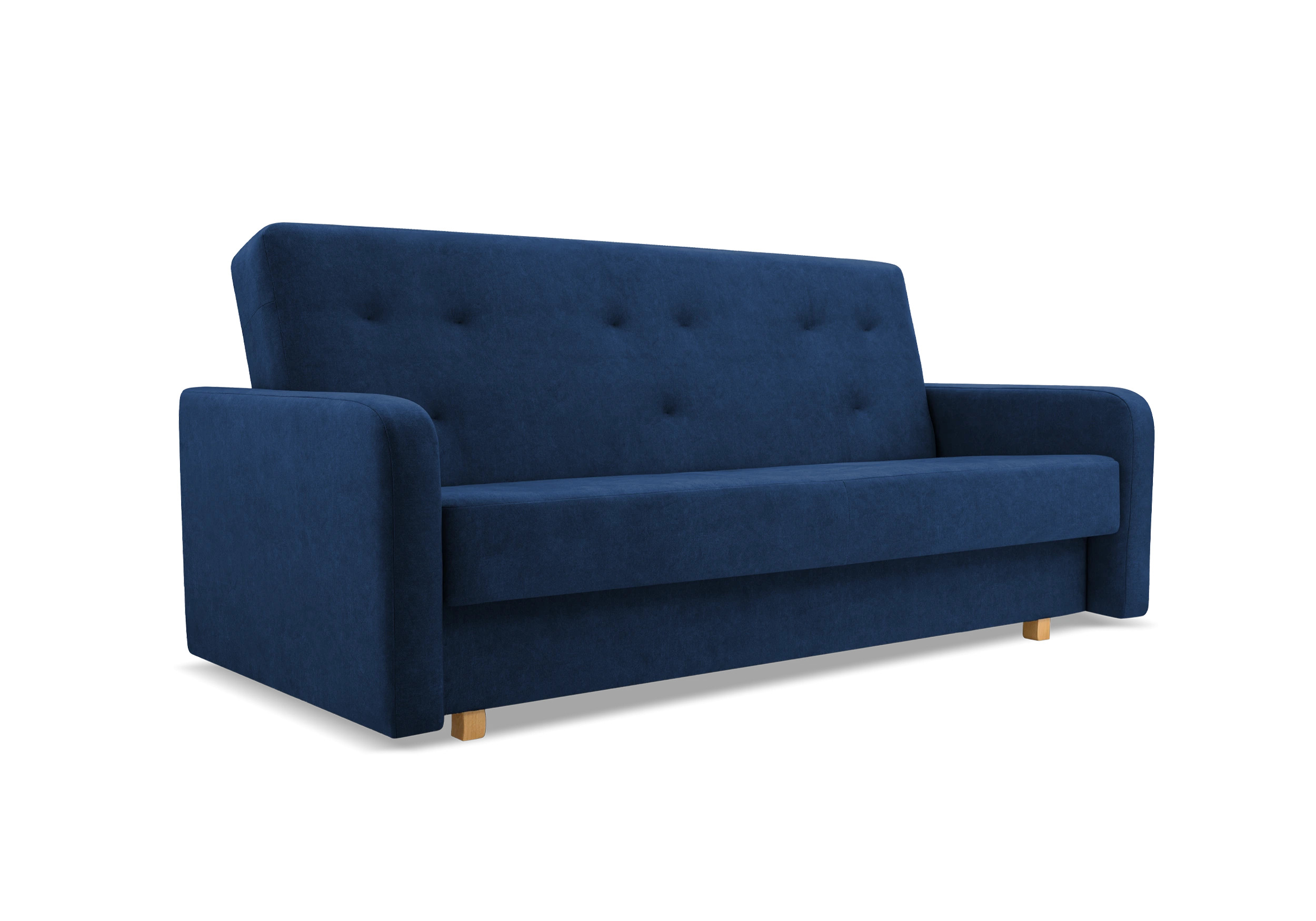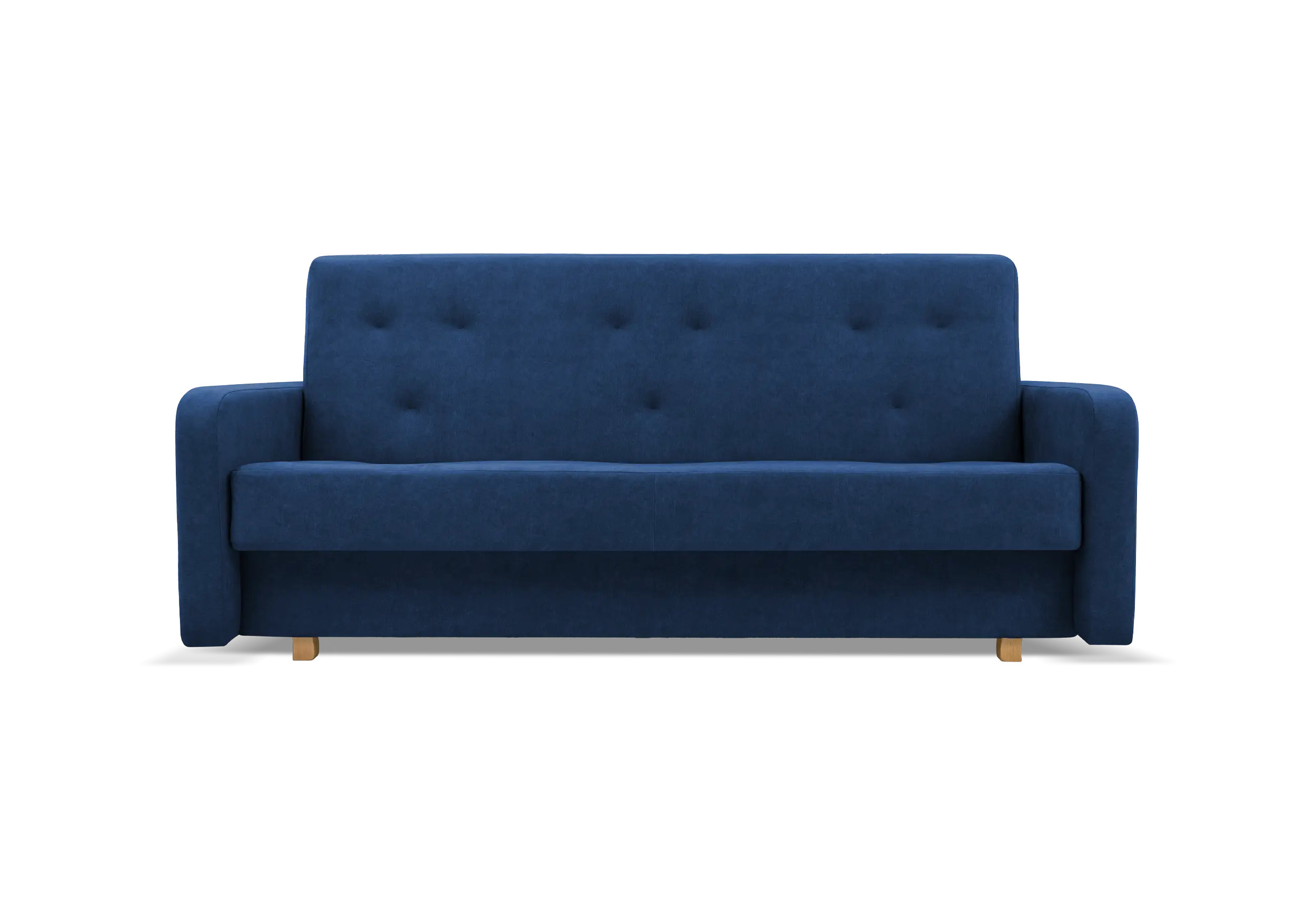Kanapa rozkładana KASIA to model, który doskonale wpisze się w każde wnętrza. Cechą charakterystyczną sofy, jest uniwersalny styl pasujący dla klasycznych jak i nowoczesnych wnętrz. Dekoracyjne wciągnięcia na oparciu doskonale komponuje się z prostą formą kanapy. Delikatne nóżki w kolorze drewna. Wersalka posiada funkcję spania. Po rozłożeniu jej powierzchnia spania osiąga 181×120 cm. W skrzyni mebla znajduje się pojemnik na pościel, w którym możesz przechować zapasową pościel lub koce.