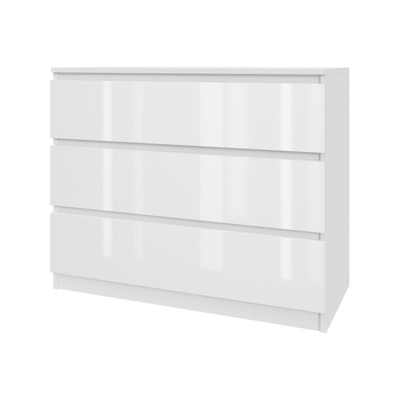 Biała komoda z błyszczącym frontem optycznie powiększy Twoje wnętrze. Jej elegancki blat doskonale nadaje się do eksponowania drobnych bibelotów. Wyposażona w sprawdzone rolkowe prowadnice, ta nowoczesna komoda oferuje wysoki komfort użytkowania dzięki łatwemu dostępowi do zawartości szuflad. Jej solidna konstrukcja z płyty wiórowej zapewnia wytrzymałość na lata.