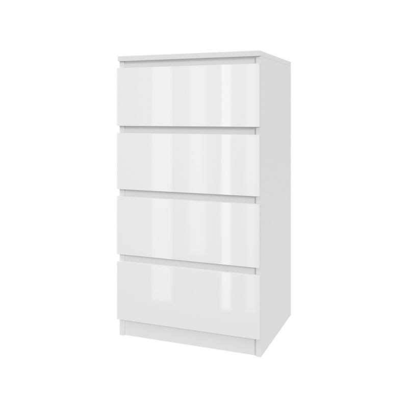 Biała komoda z błyszczącym frontem optycznie powiększy Twoje wnętrze. Jej elegancki blat doskonale nadaje się do eksponowania drobnych bibelotów. Wyposażona w sprawdzone rolkowe prowadnice, ta nowoczesna komoda oferuje wysoki komfort użytkowania dzięki łatwemu dostępowi do zawartości szuflad. Jej solidna konstrukcja z płyty wiórowej zapewnia wytrzymałość na lata.