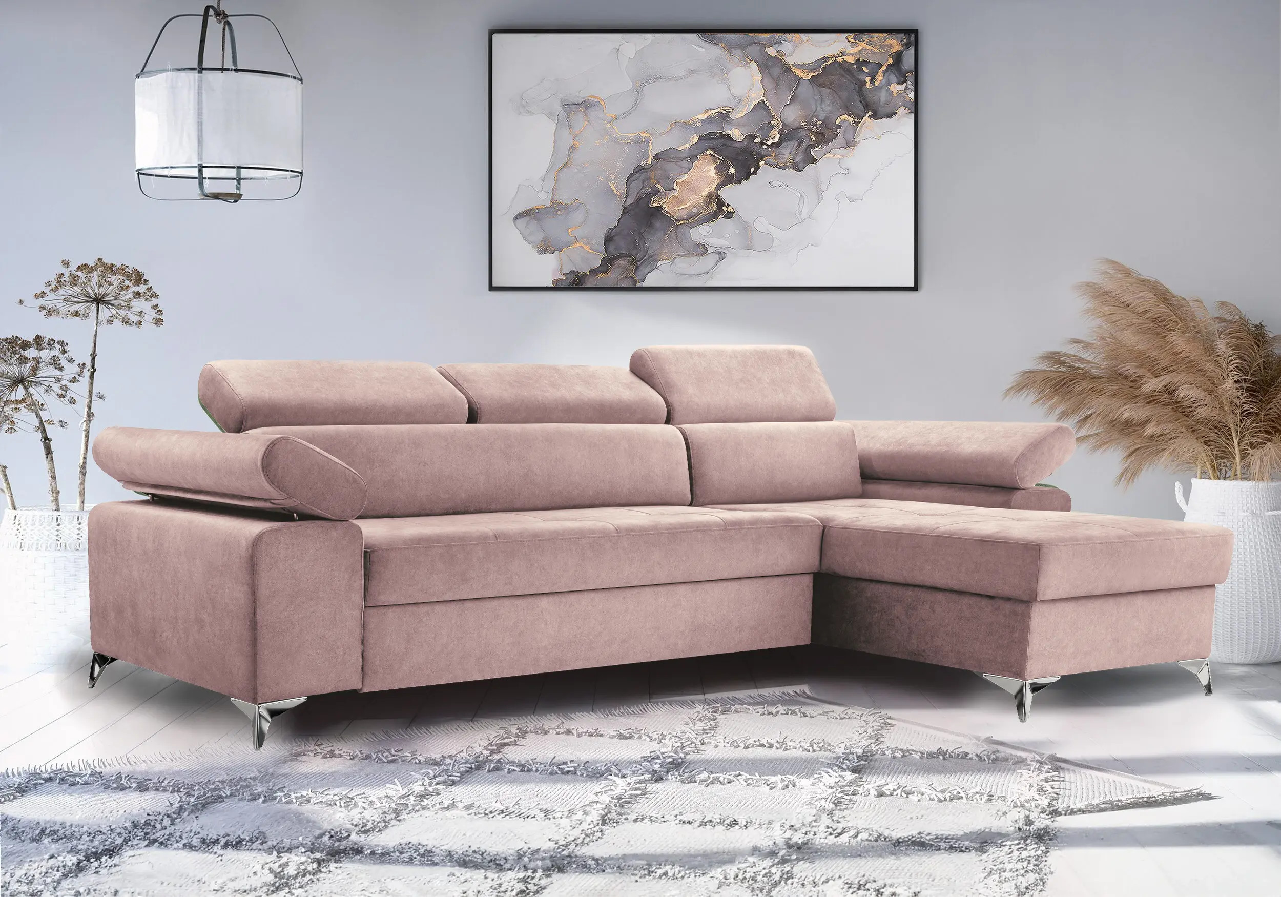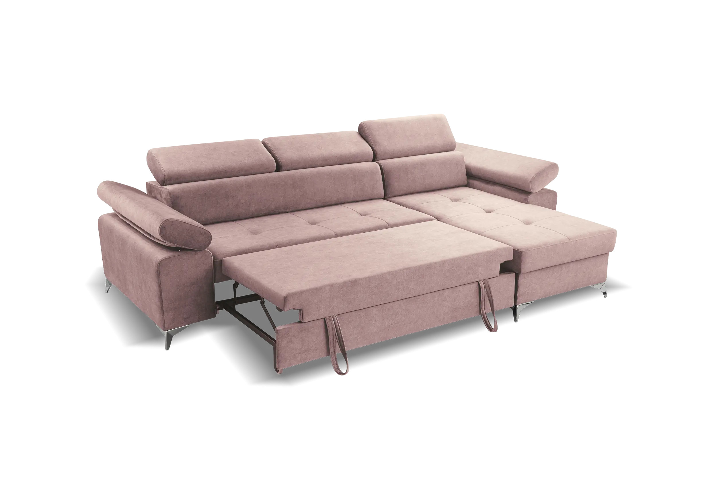 Narożnik z funkcją spania Malyn dostępny jest w ciekawej kolorystyce a nowoczesne srebrne nóżki, nadają nowoczesnego stylu. Regulowane zagłówki. Boczek narożnika z regulowanym podłokietnikiem . Narożnik został wyposażony w funkcję spania 203x127cm oraz pojemnik na pościel. Po rozłożeniu część przeznaczona do spanie obita w kolorze narożnika.