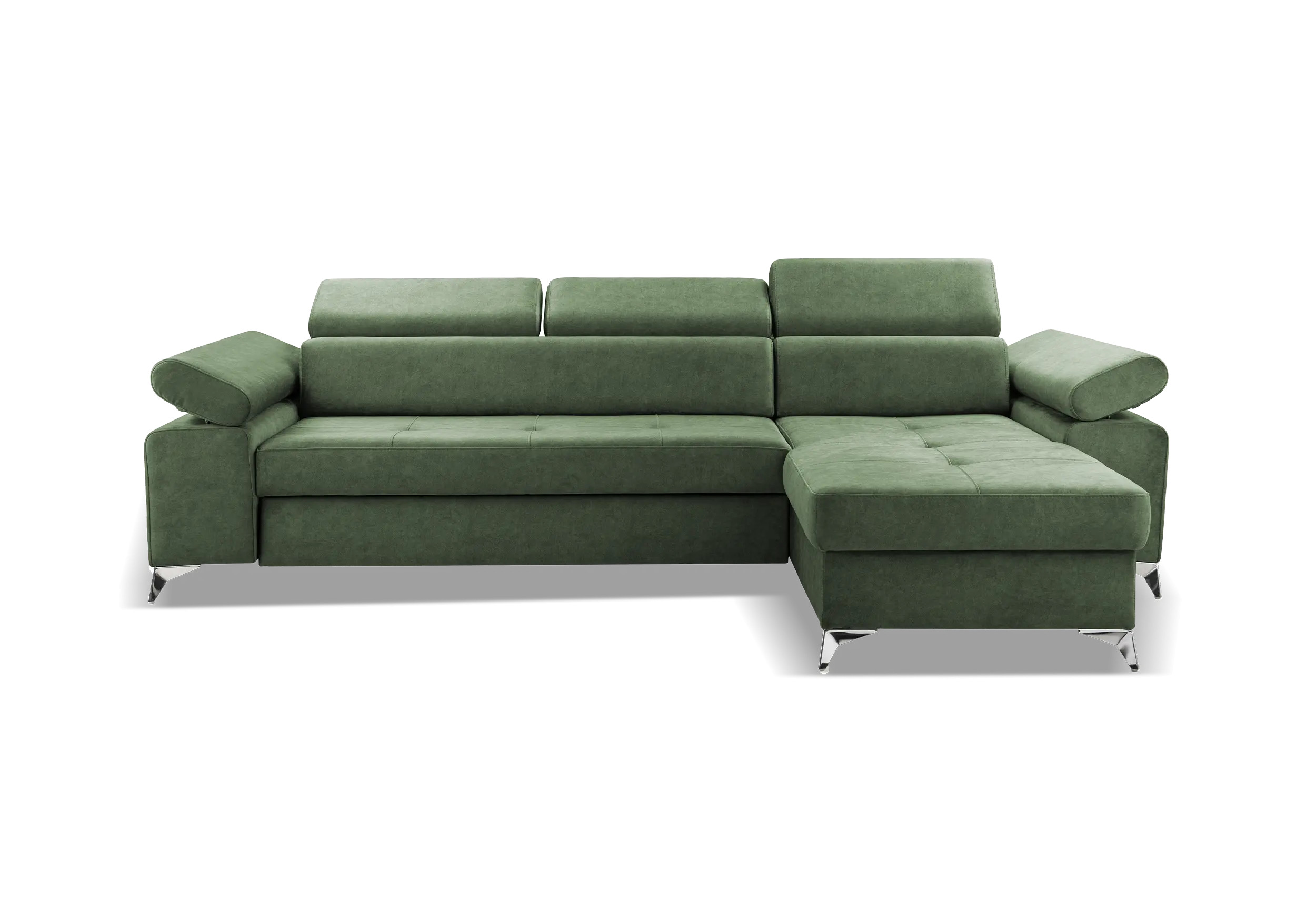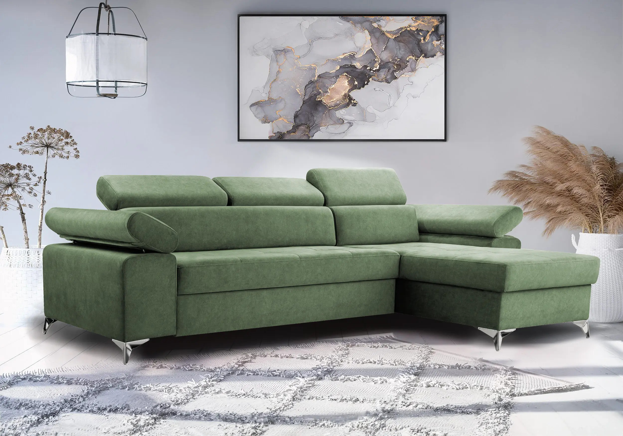 Narożnik z funkcją spania Malyn dostępny jest w ciekawej kolorystyce a nowoczesne srebrne nóżki, nadają nowoczesnego stylu. Regulowane zagłówki. Boczek narożnika z regulowanym podłokietnikiem . Narożnik został wyposażony w funkcję spania 203x127cm oraz pojemnik na pościel. Po rozłożeniu część przeznaczona do spanie obita w kolorze narożnika.