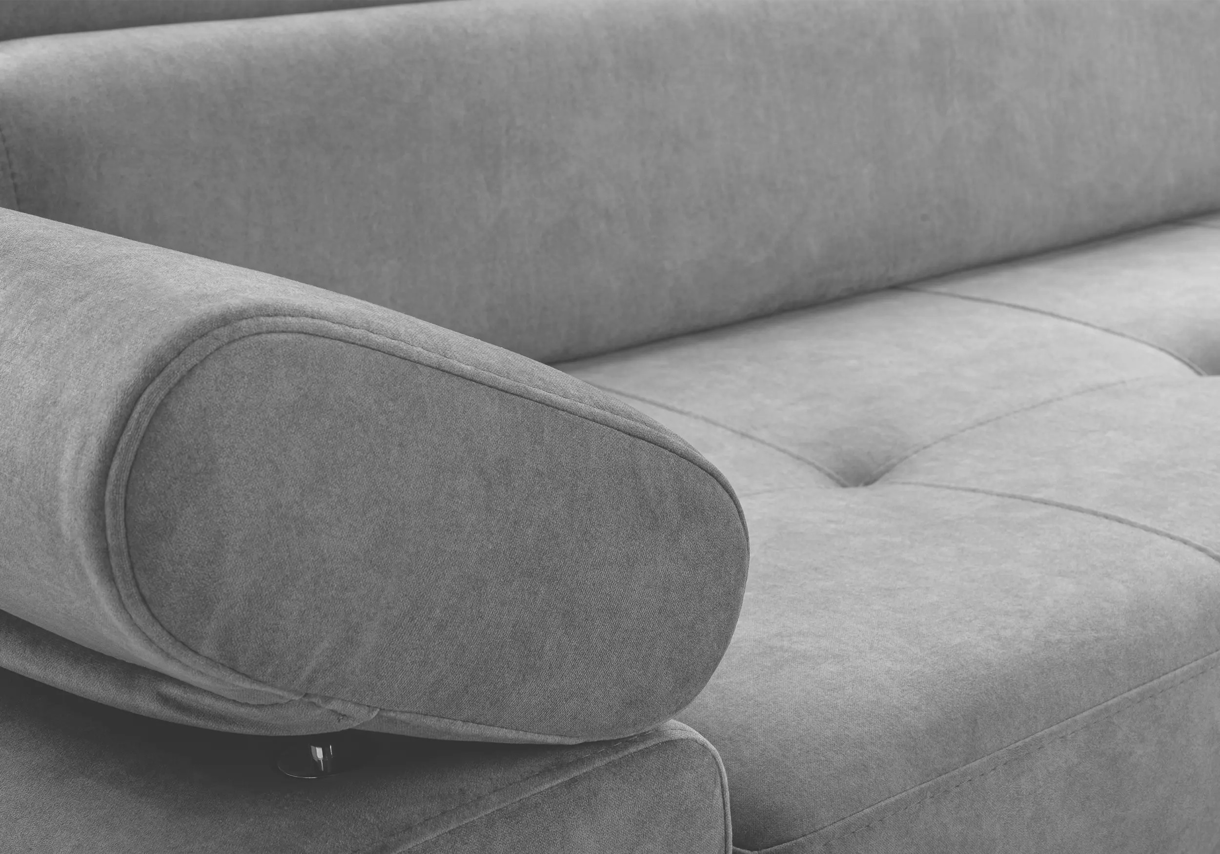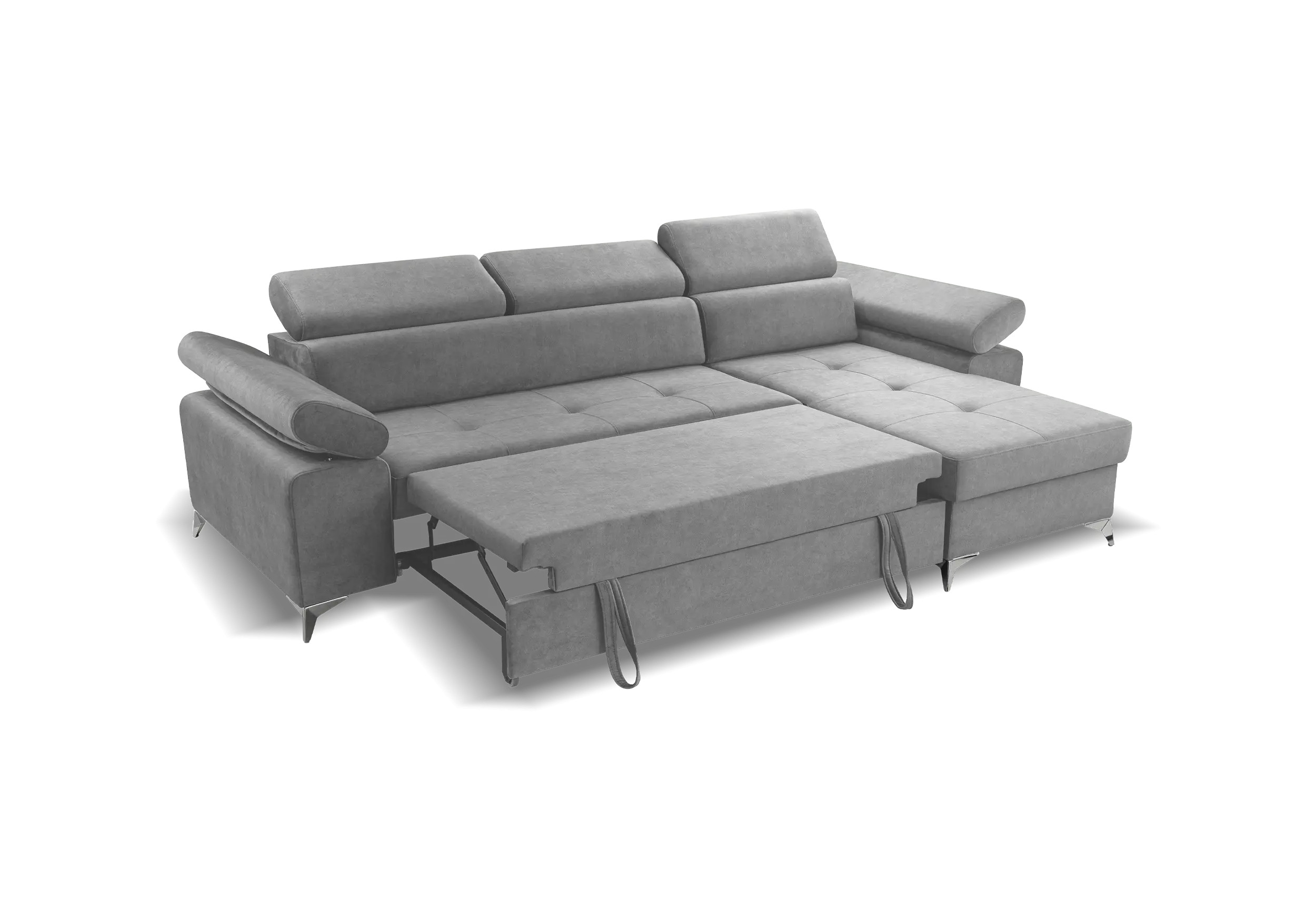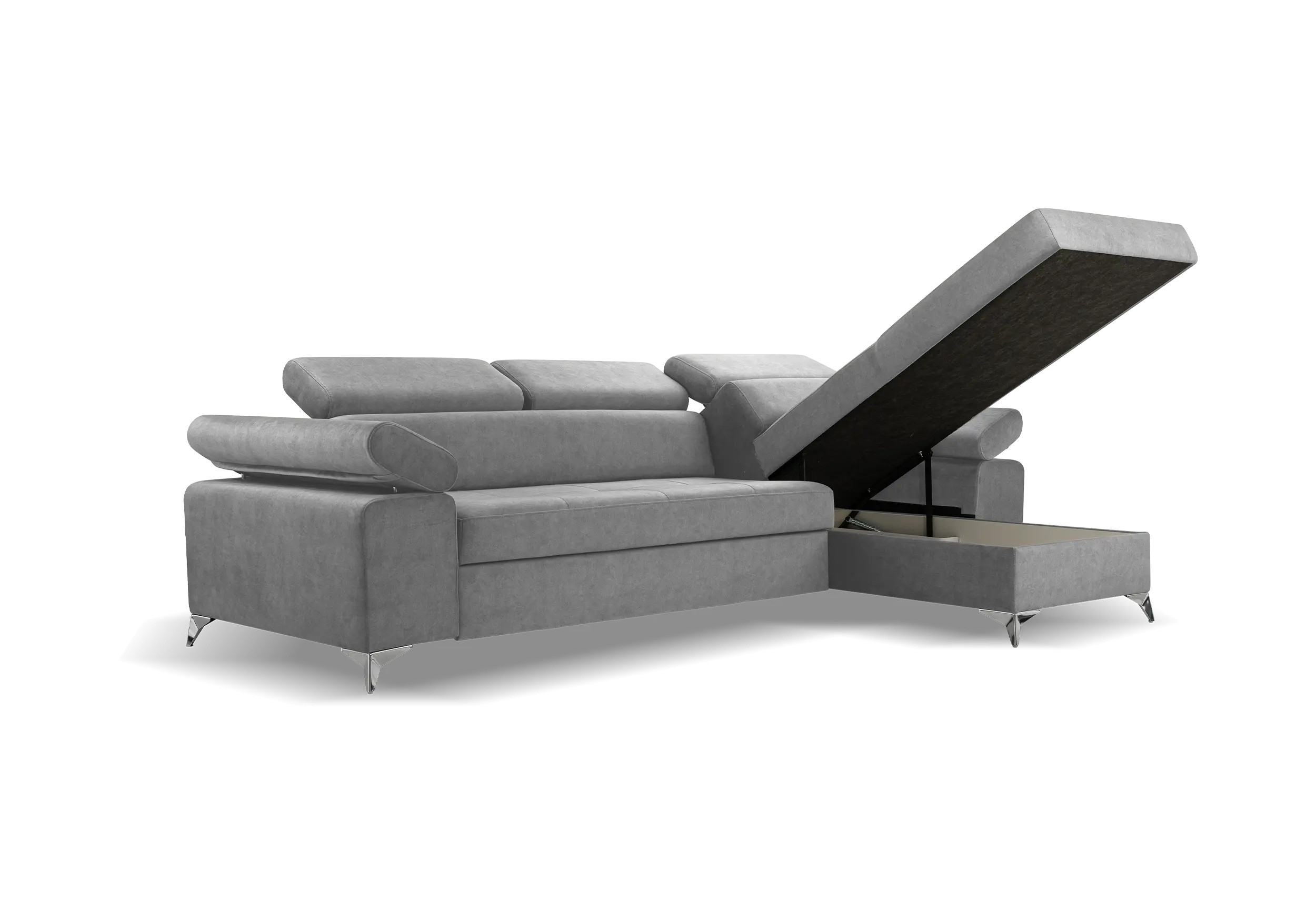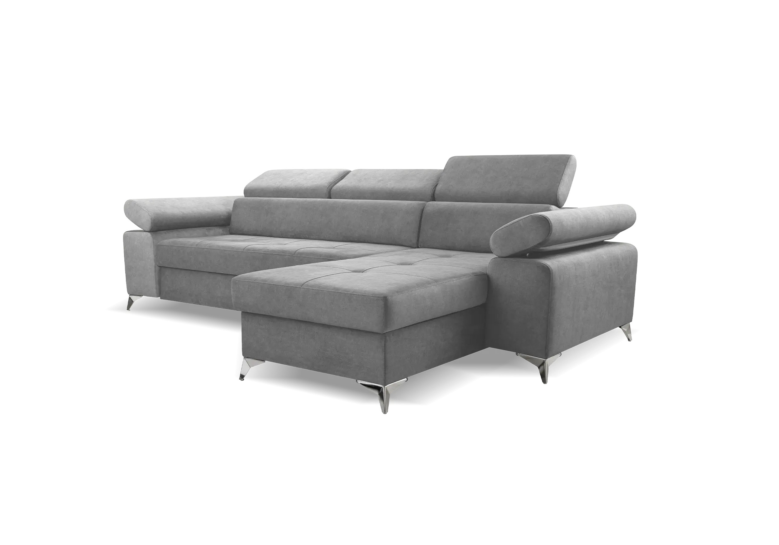 Narożnik z funkcją spania Malyn dostępny jest w ciekawej kolorystyce a nowoczesne srebrne nóżki, nadają nowoczesnego stylu. Regulowane zagłówki. Boczek narożnika z regulowanym podłokietnikiem . Narożnik został wyposażony w funkcję spania 203x127cm oraz pojemnik na pościel. Po rozłożeniu część przeznaczona do spanie obita w kolorze narożnika.