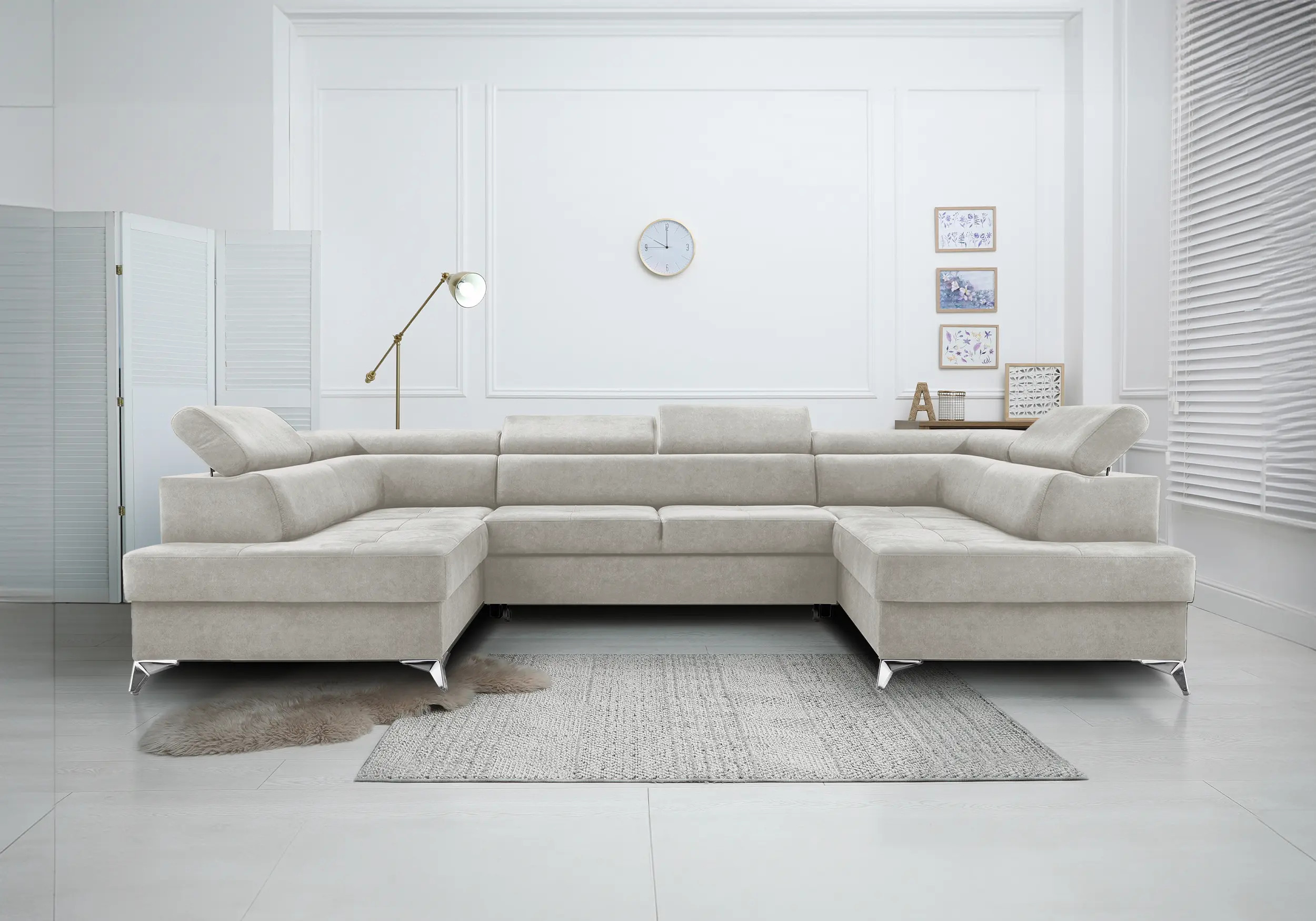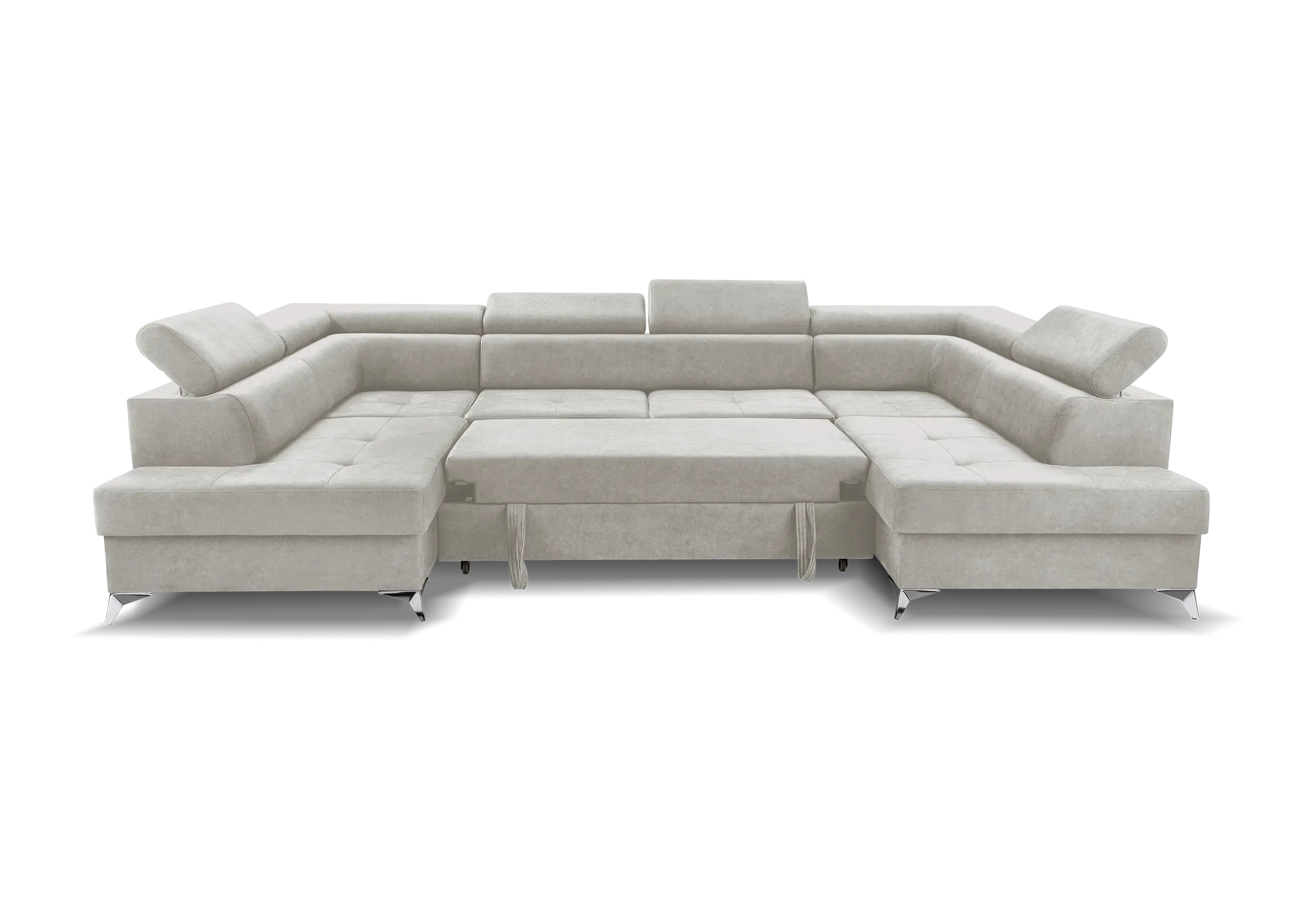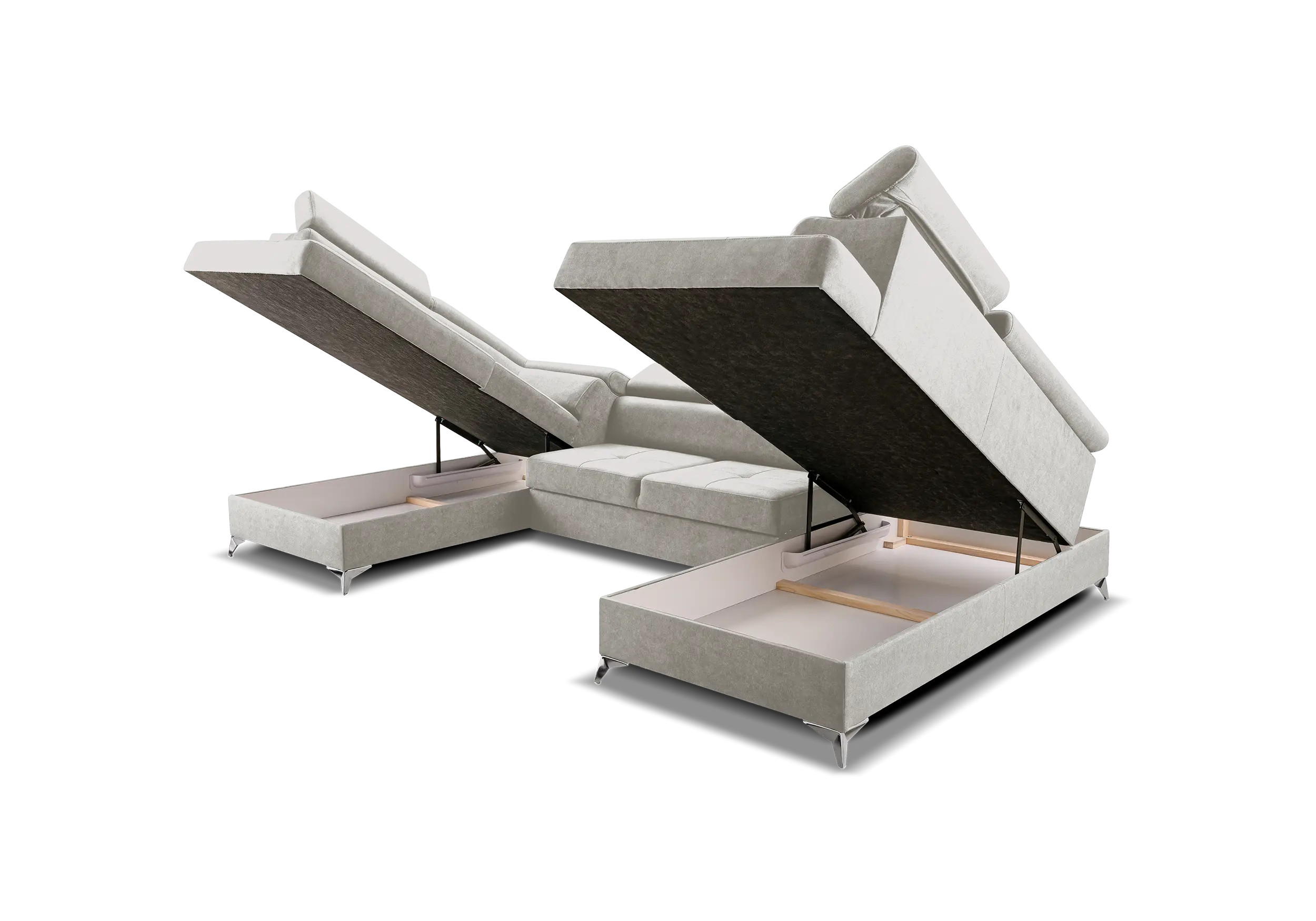 Narożnik z funkcją spania Barcelona dostępny jest w ciekawej kolorystyce a nowoczesne srebrne nóżki, nadają nowoczesnego stylu. Regulowane zagłówki. Boczek narożnika z regulowanym podłokietnikiem . Narożnik został wyposażony w funkcję spania oraz dwa pojemniki na pościel.