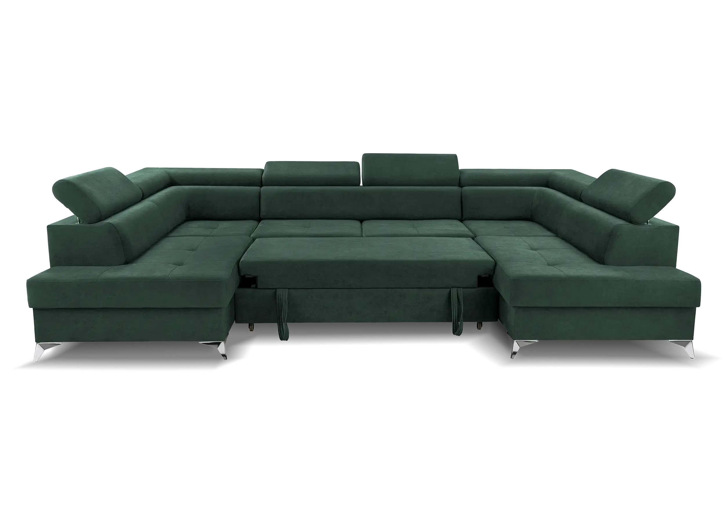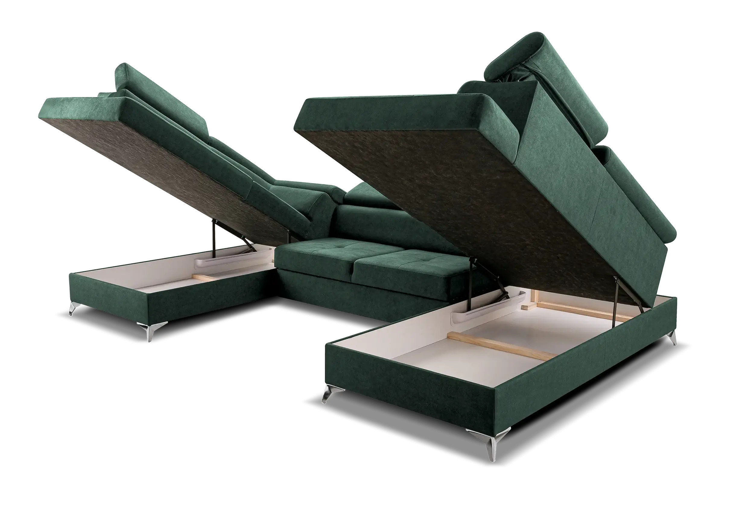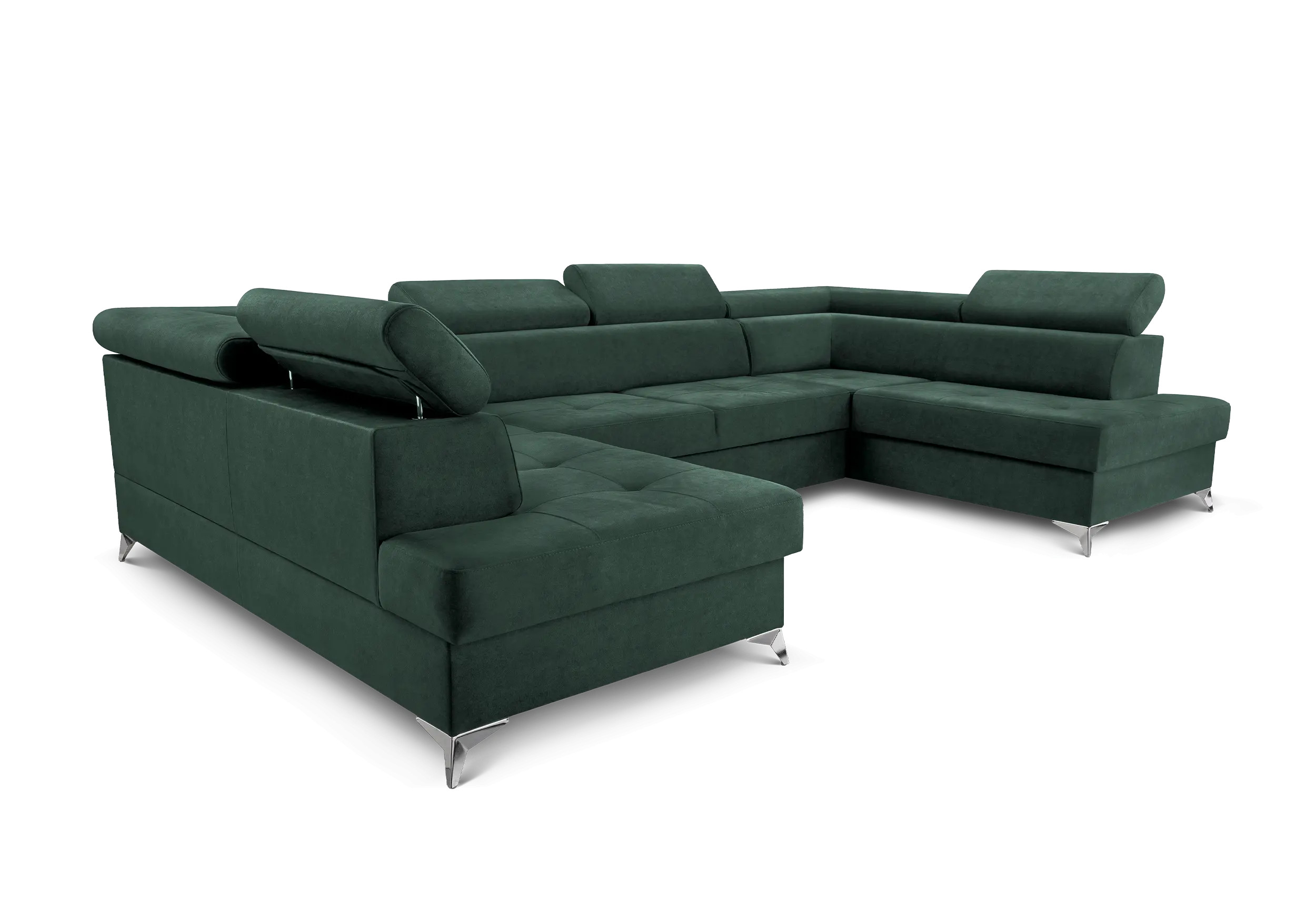 Narożnik z funkcją spania Barcelona dostępny jest w ciekawej kolorystyce a nowoczesne srebrne nóżki, nadają nowoczesnego stylu. Regulowane zagłówki. Boczek narożnika z regulowanym podłokietnikiem . Narożnik został wyposażony w funkcję spania oraz dwa pojemniki na pościel.