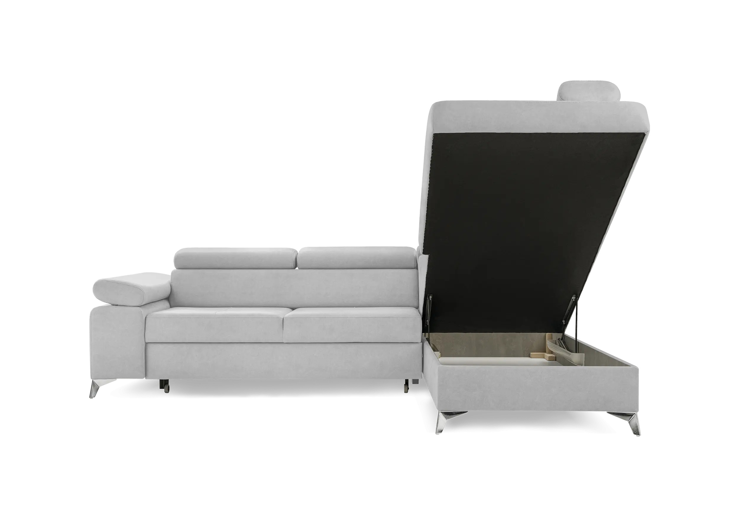 Narożnik z funkcją spania Renée dostępny jest w ciekawej kolorystyce a nowoczesne srebrne nóżki, nadają nowoczesnego stylu. Regulowane oparcie. Boczek narożnika z regulowanym podłokietnikiem . Narożnik został wyposażony w funkcję spania 203x127cm oraz pojemnik na pościel.