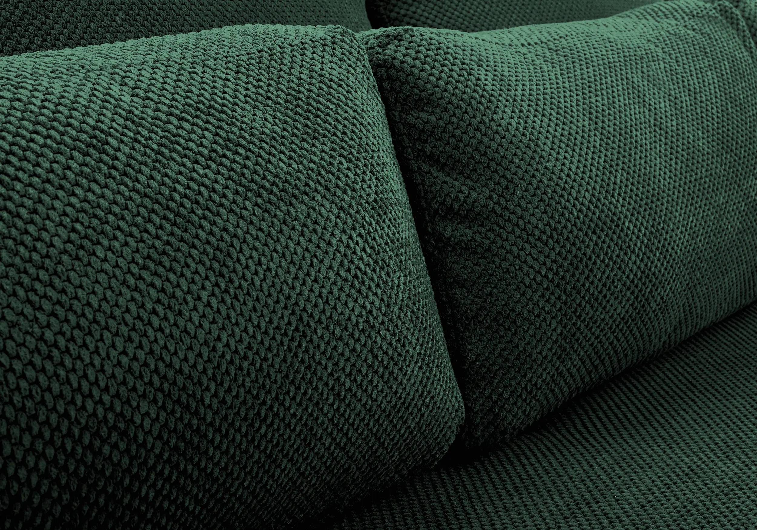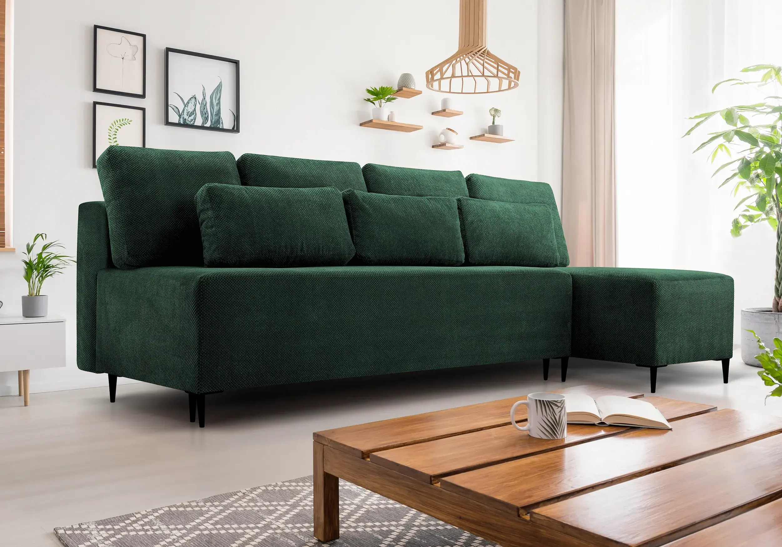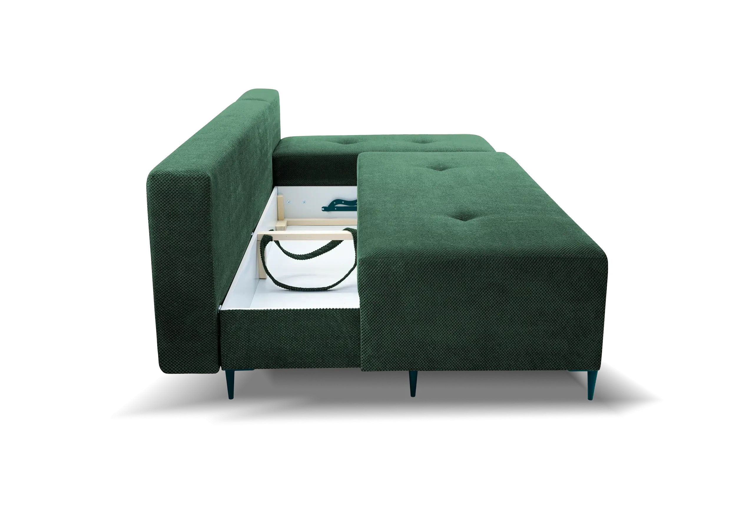Narożnik z funkcją spania Keno dostępny jest w ciekawej kolorystyce, a nowoczesne czarne nóżki, nadają nowoczesnego stylu. Wyposażony w 7 poduszek. Narożnik został wyposażony w funkcję spania 120x251cm oraz pojemnik na pościel.