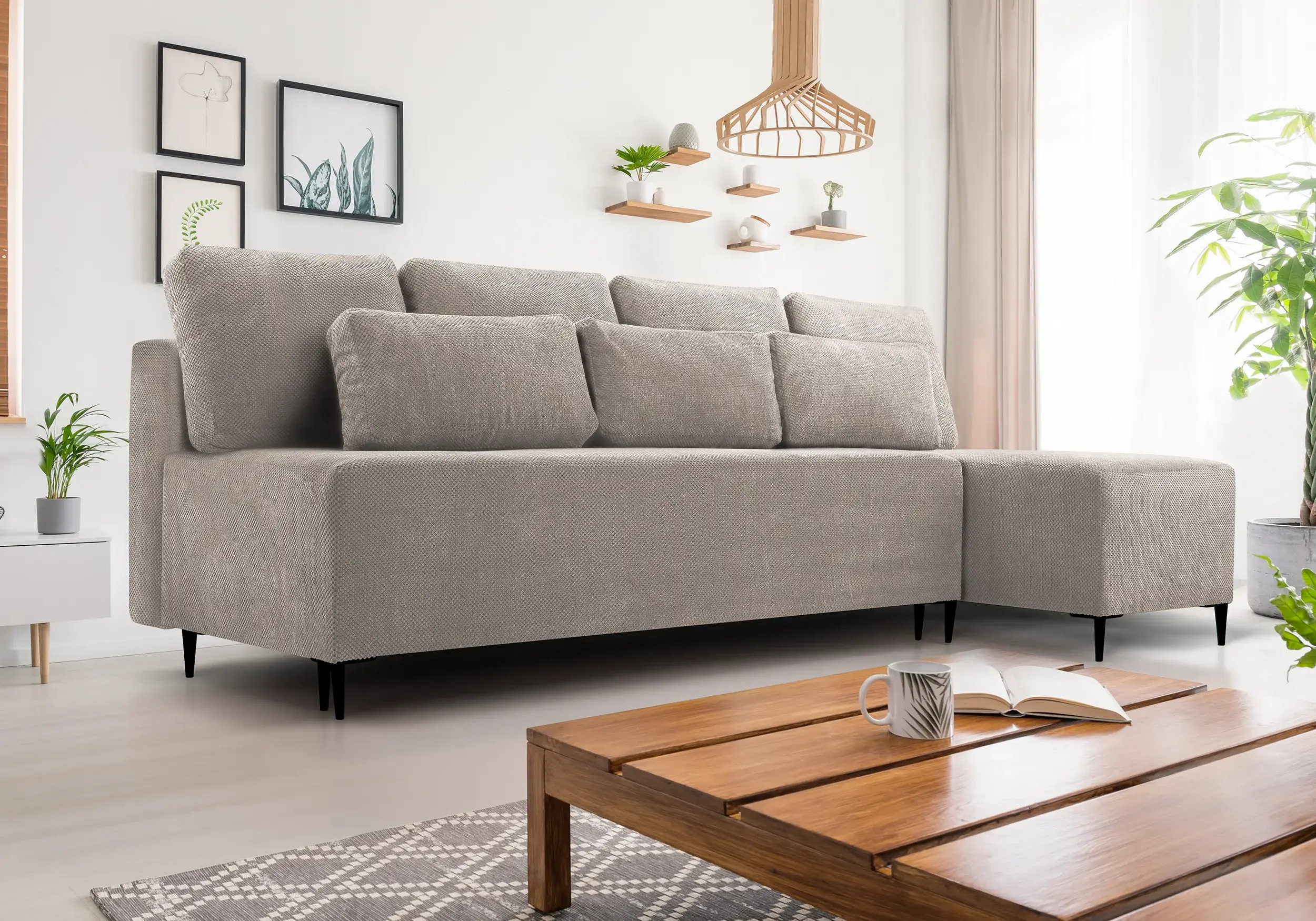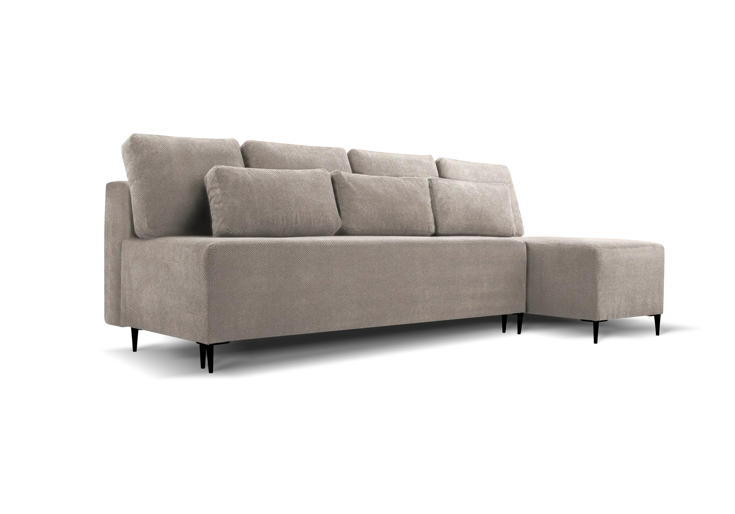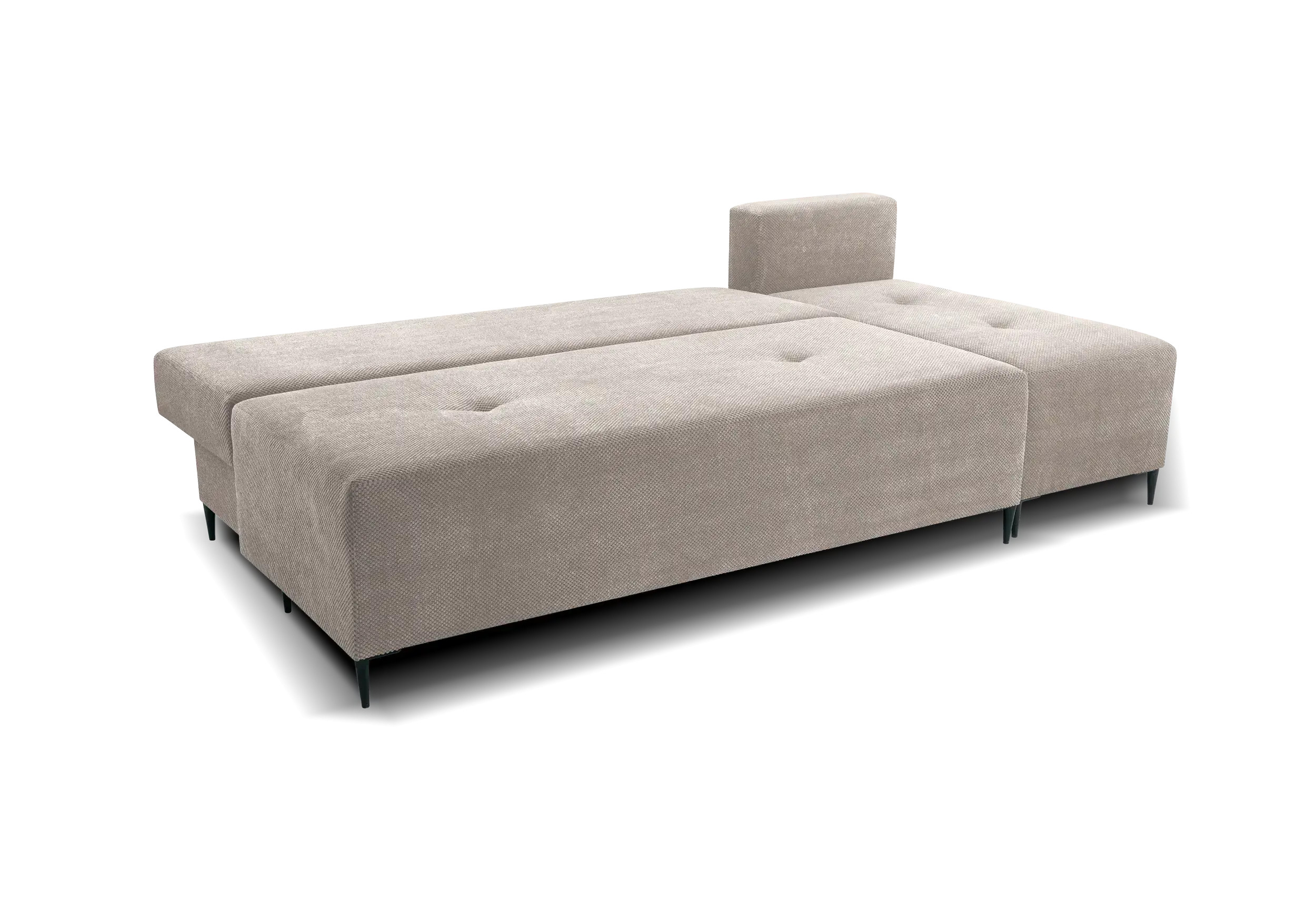 Narożnik z funkcją spania Keno dostępny jest w ciekawej kolorystyce, a nowoczesne czarne nóżki, nadają nowoczesnego stylu. Wyposażony w 7 poduszek. Narożnik został wyposażony w funkcję spania 120x251cm oraz pojemnik na pościel.