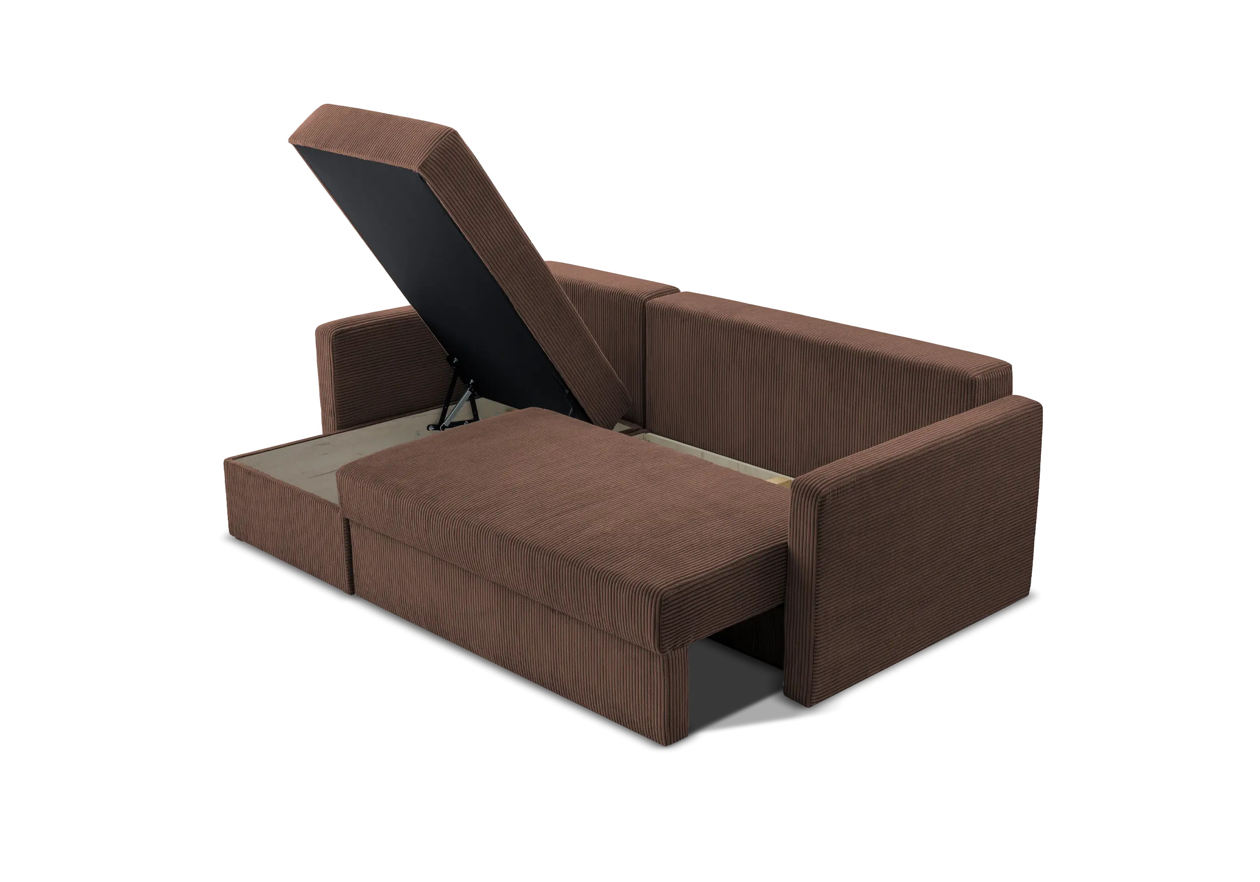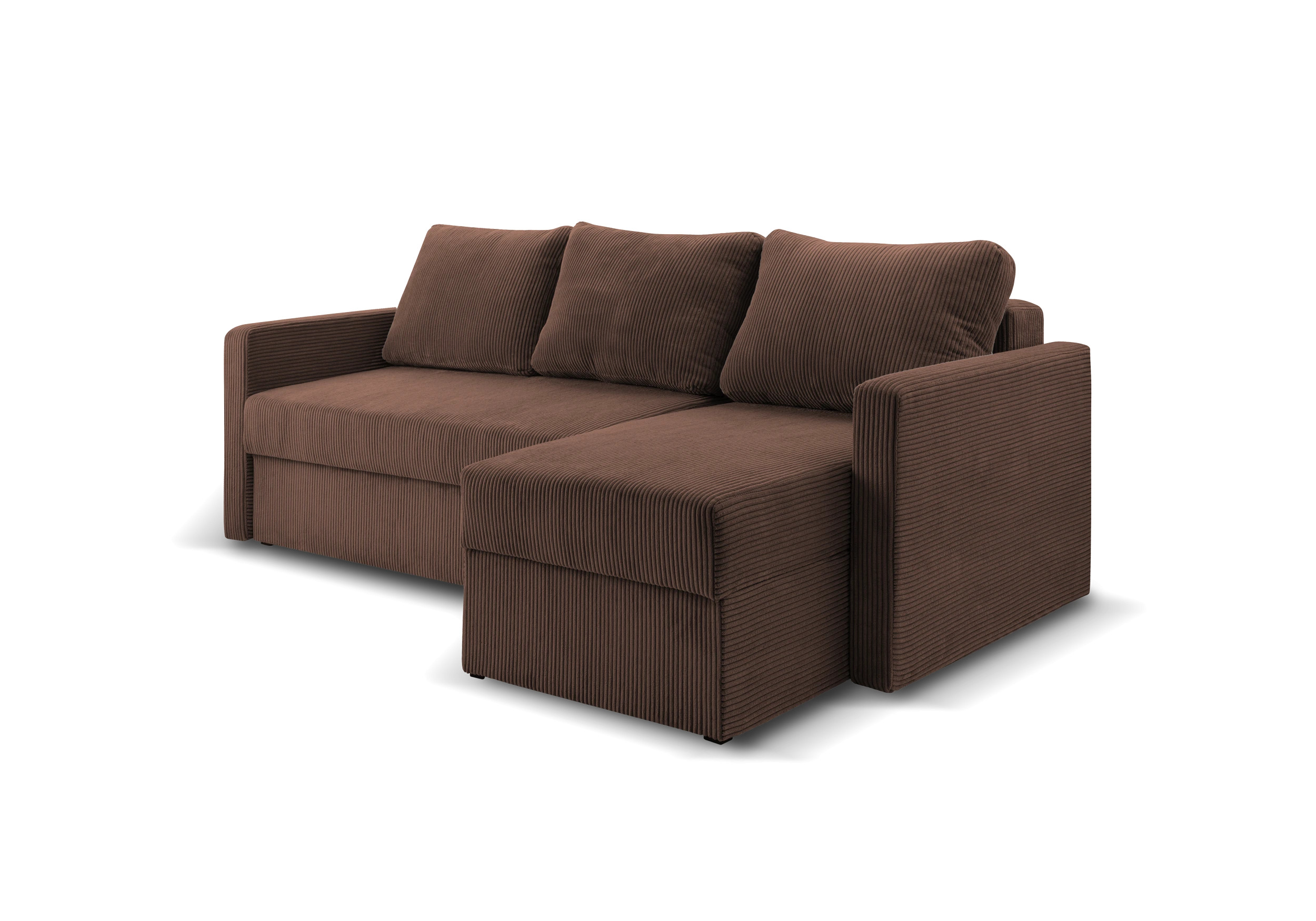 Narożnik z funkcją spania Elton dostępny jest w ciekawej kolorystyce w sztruksowanej tkaninie typu Velvet. Narożnik został wyposażony w funkcję spania oraz pojemnikiem na pościel. Po rozłożeniu część przeznaczona do spanie obita w kolorze narożnika.