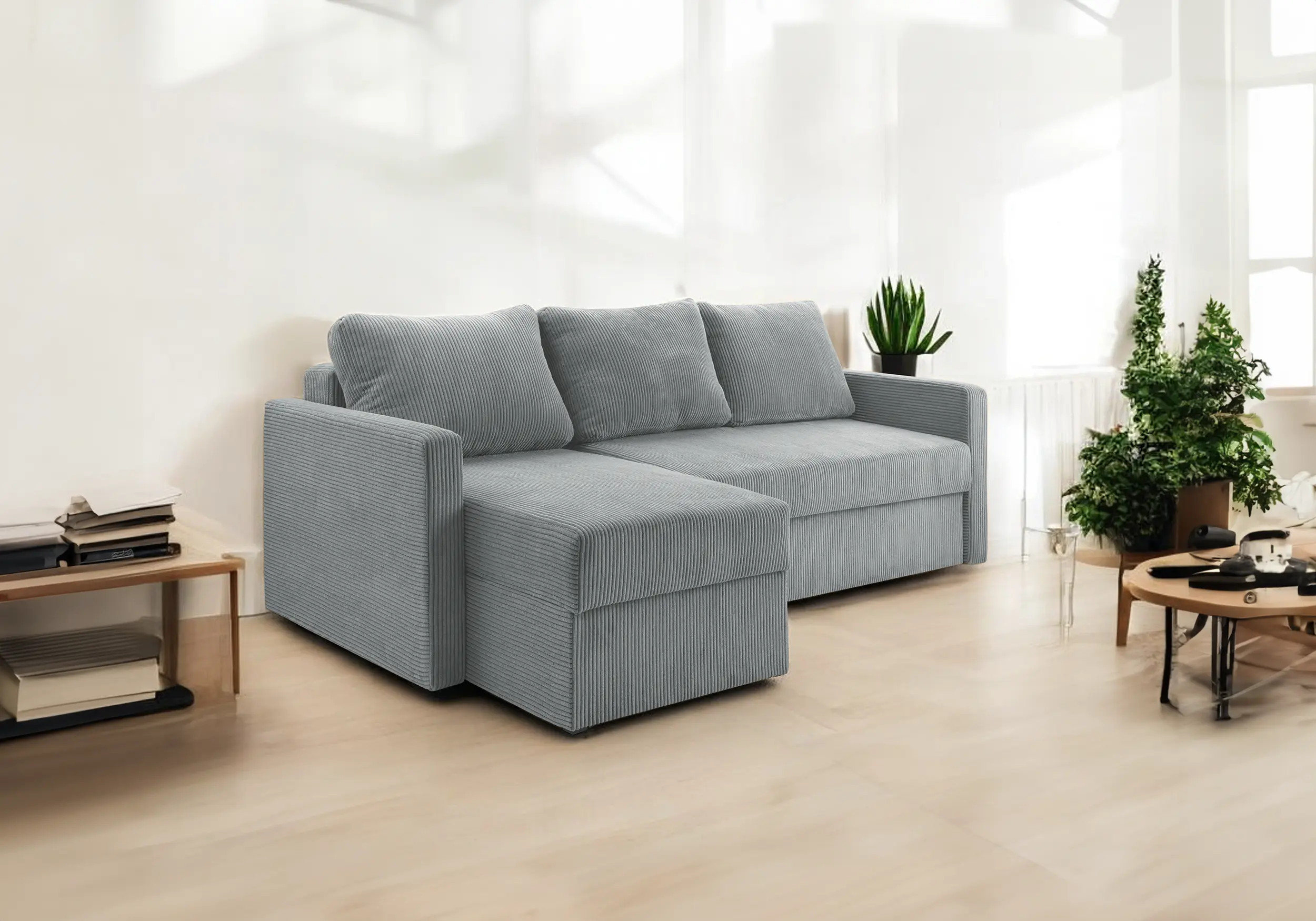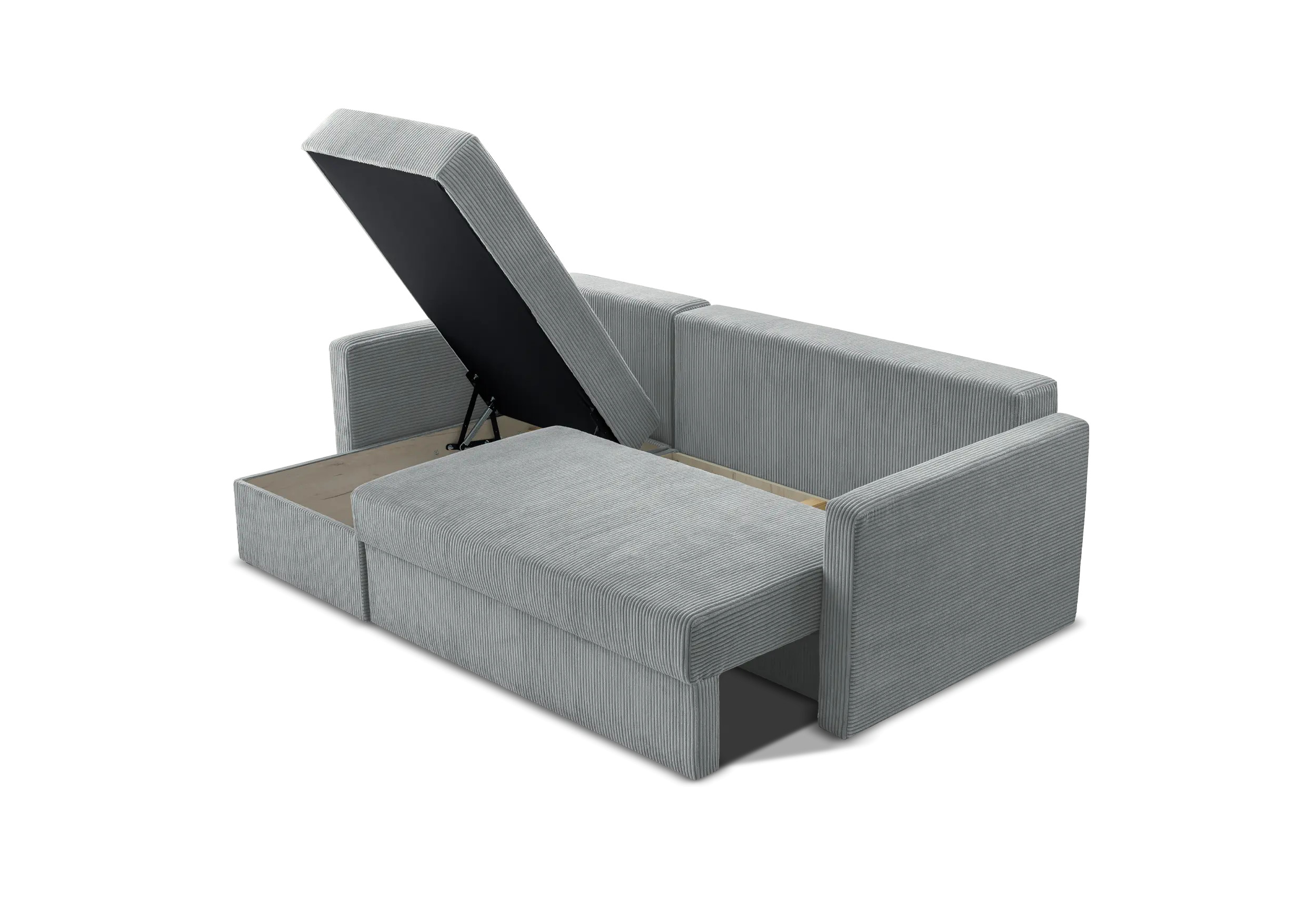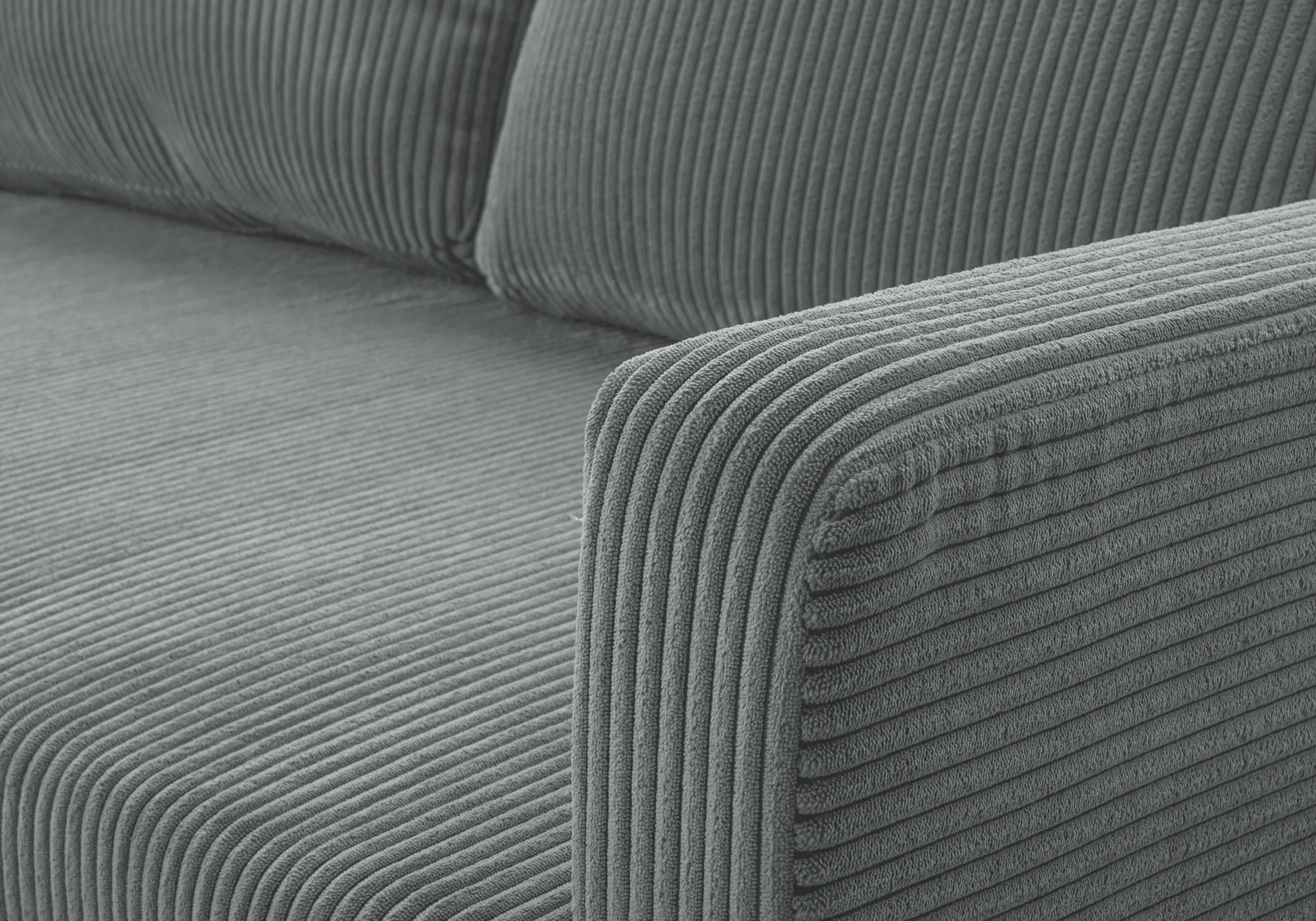 Narożnik z funkcją spania Elton dostępny jest w ciekawej kolorystyce w sztruksowanej tkaninie typu Velvet. Narożnik został wyposażony w funkcję spania oraz pojemnikiem na pościel. Po rozłożeniu część przeznaczona do spanie obita w kolorze narożnika.