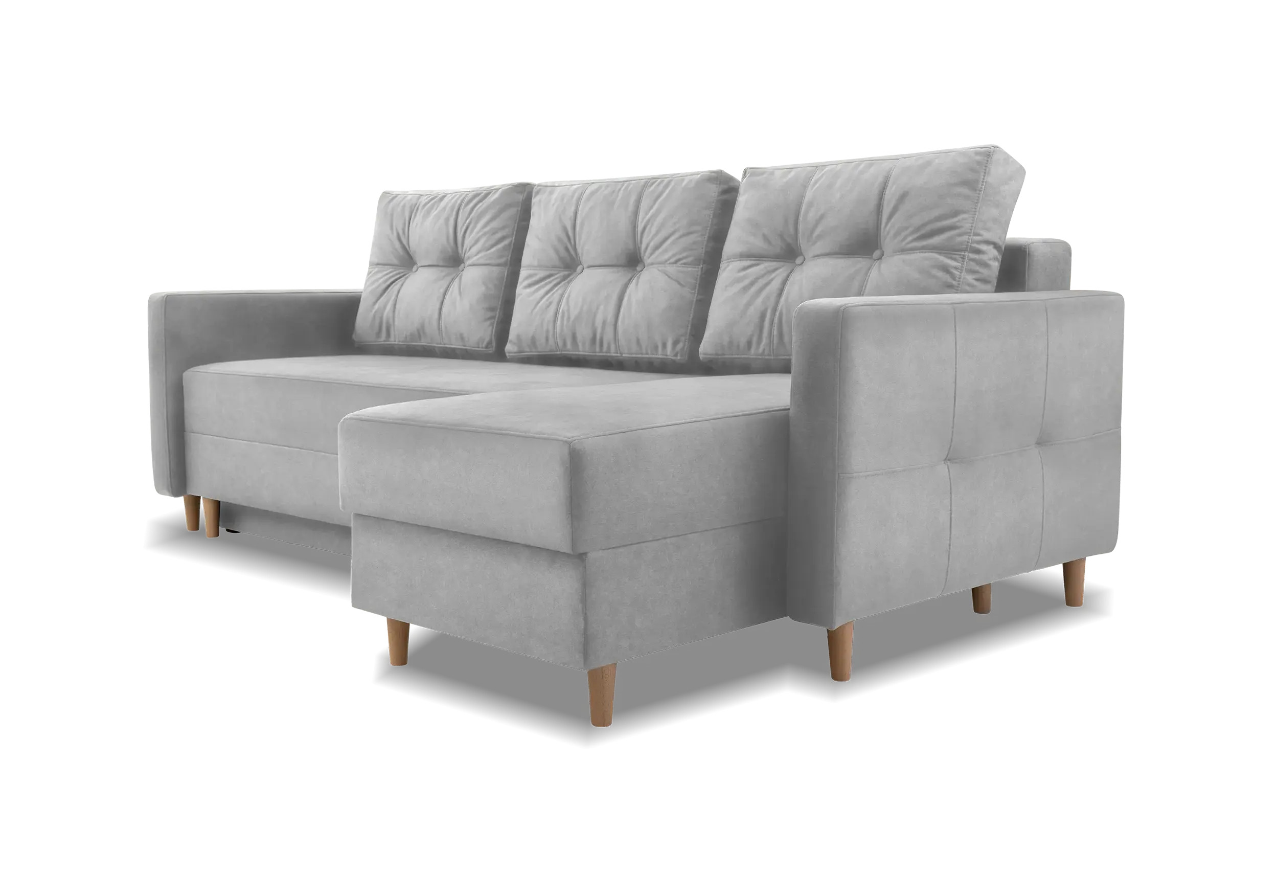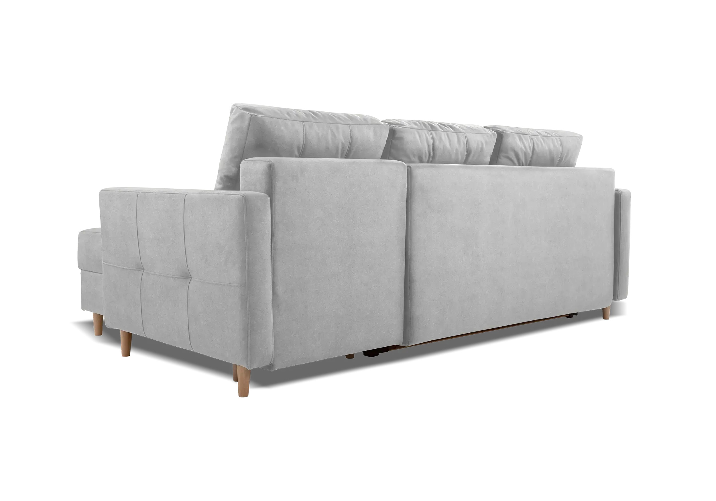 Narożnik West dostępny jest w ciekawej kolorystyce a drewniane nóżki, nawiązują do stylu skandynawskiego. Oparcie narożnika wypełniają miękkie podwójnie pikowane poduszki, które dbają o komfort użytkowania. Boczki narożnika również zostały ozdobione tym pikowaniem. Dodatkowo narożnik został wyposażony w funkcję spania 209x140cm oraz 2 pojemniki na pościel.