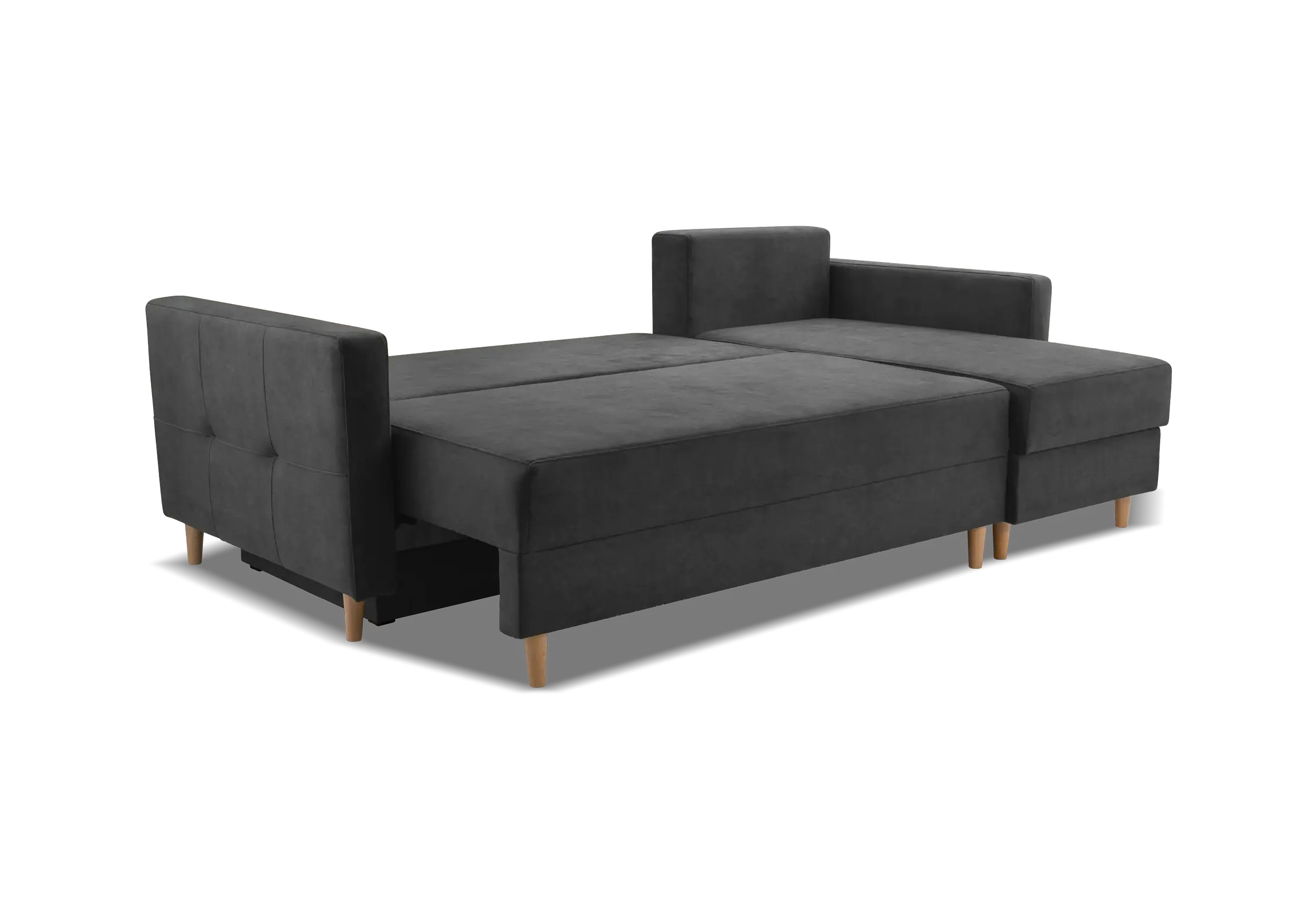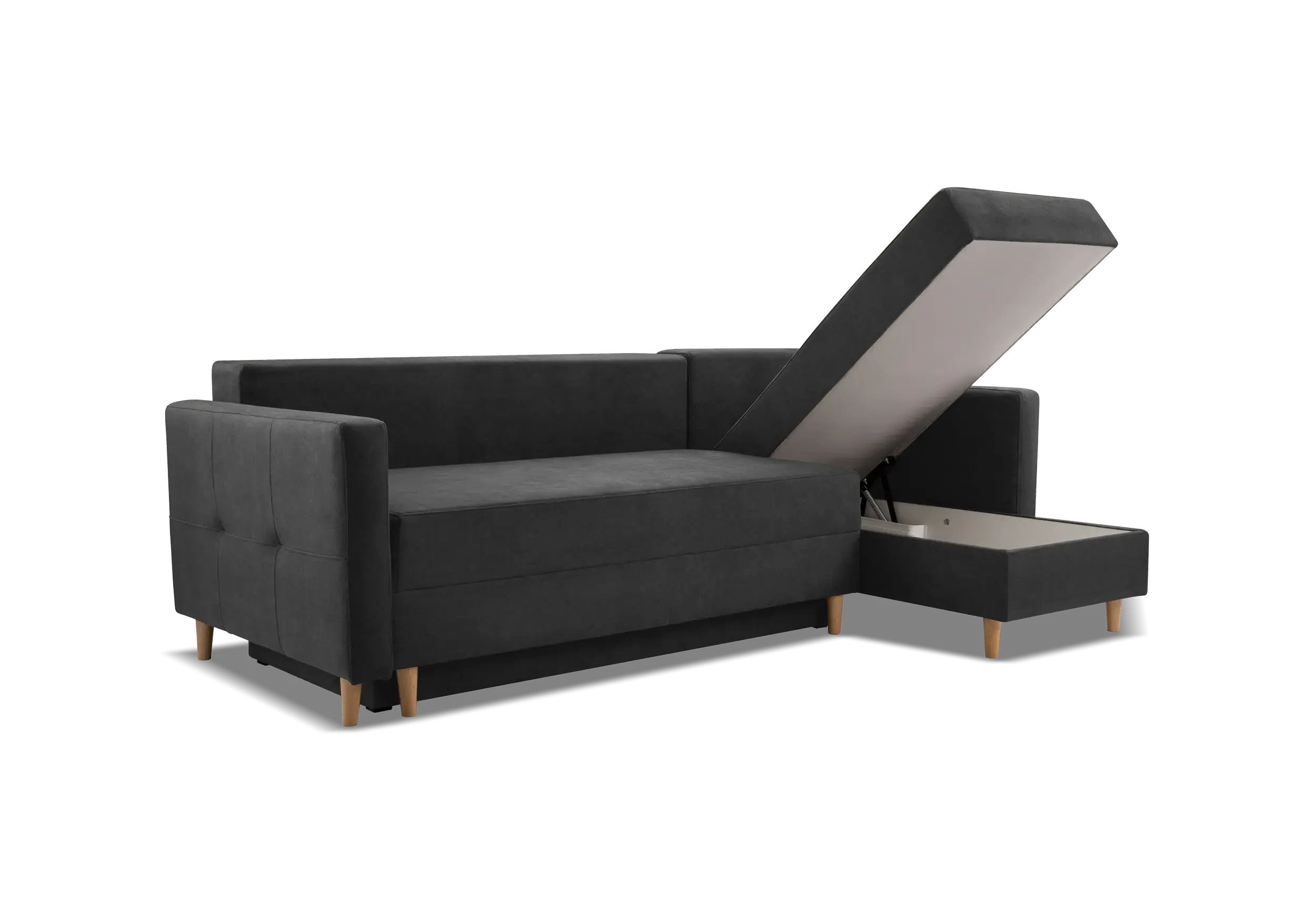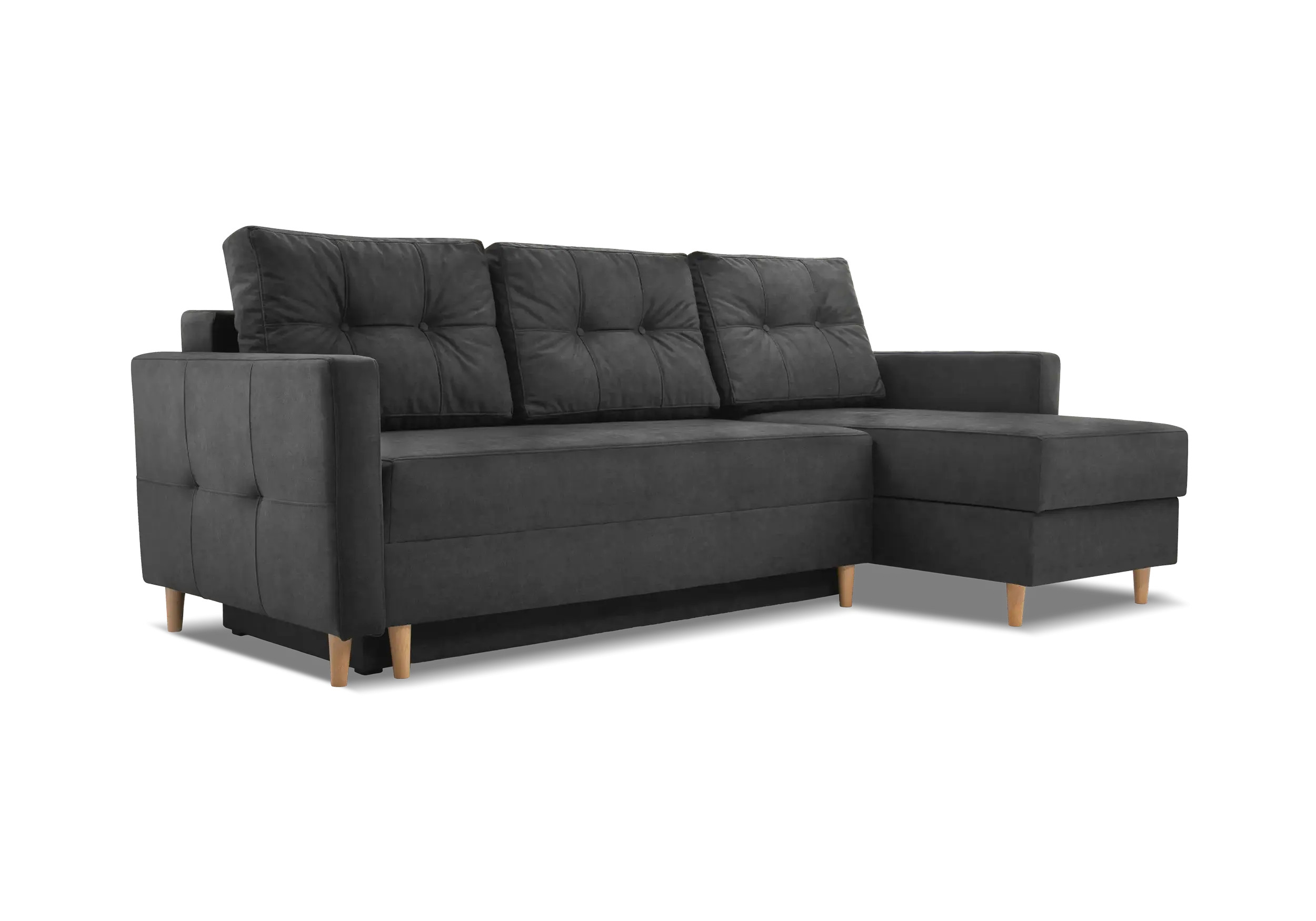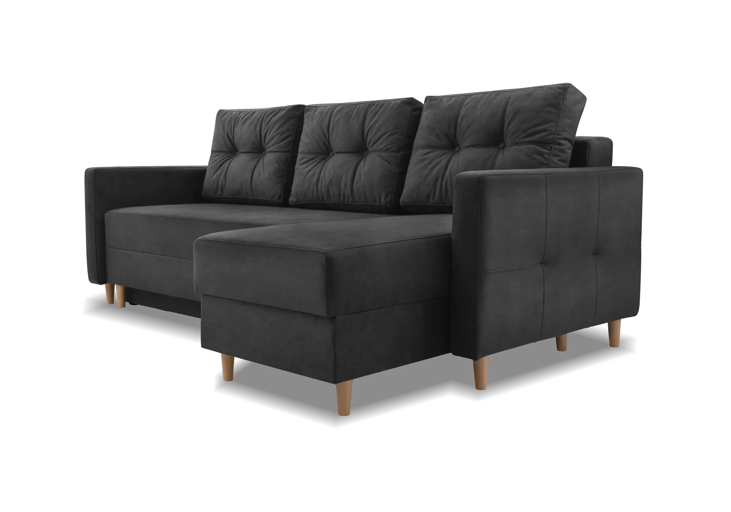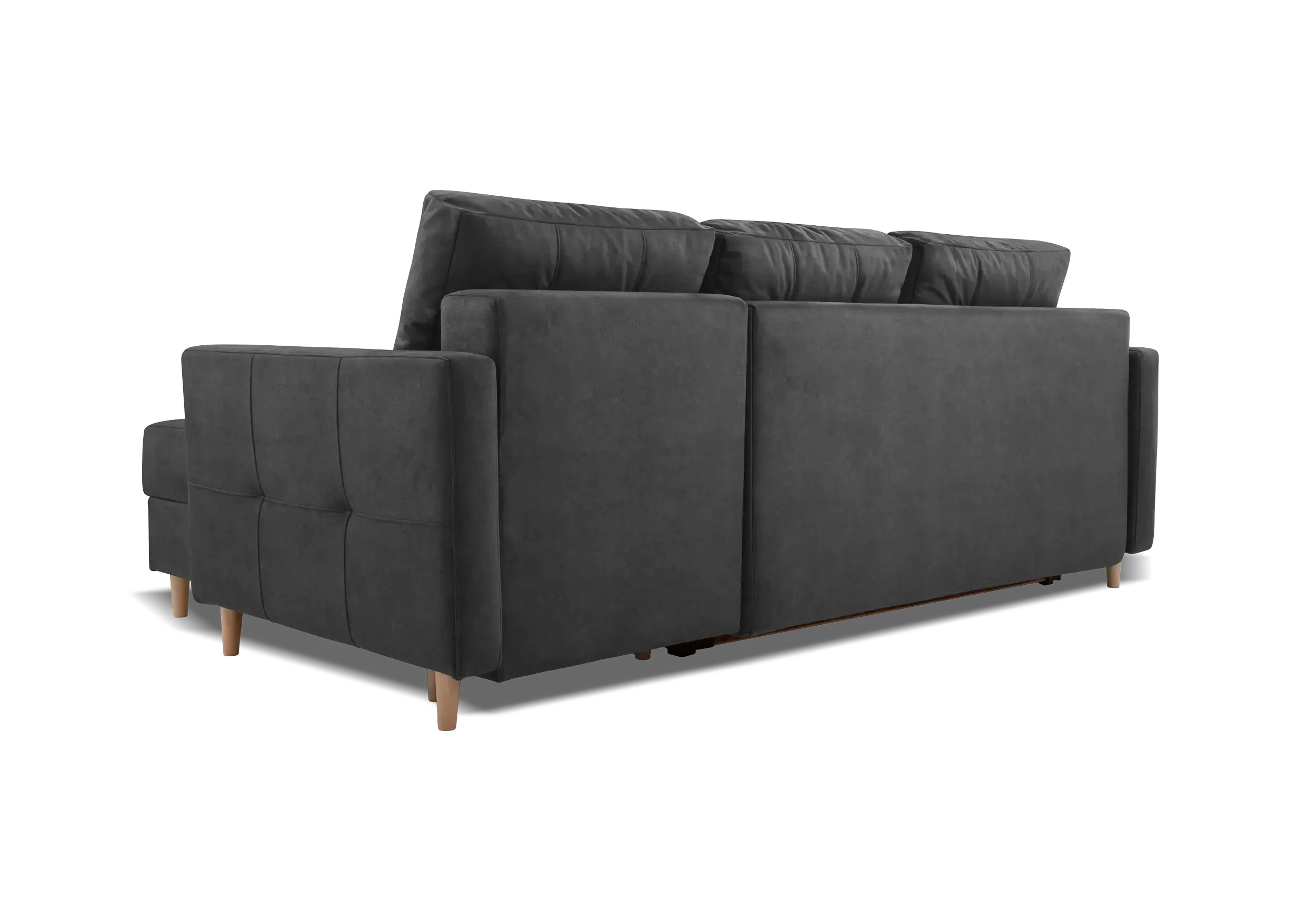 Narożnik West dostępny jest w ciekawej kolorystyce a drewniane nóżki, nawiązują do stylu skandynawskiego. Oparcie narożnika wypełniają miękkie podwójnie pikowane poduszki, które dbają o komfort użytkowania. Boczki narożnika również zostały ozdobione tym pikowaniem. Dodatkowo narożnik został wyposażony w funkcję spania 209x140cm oraz 2 pojemniki na pościel.