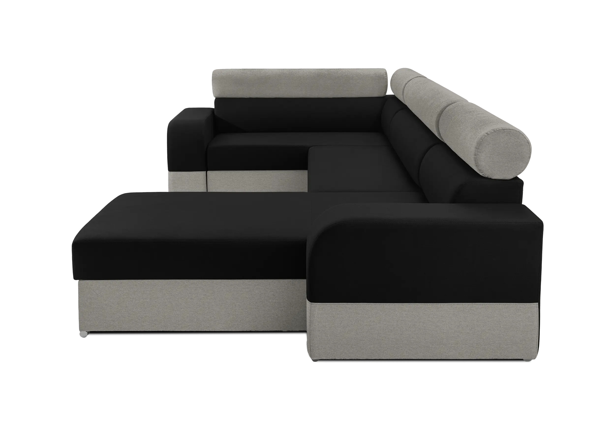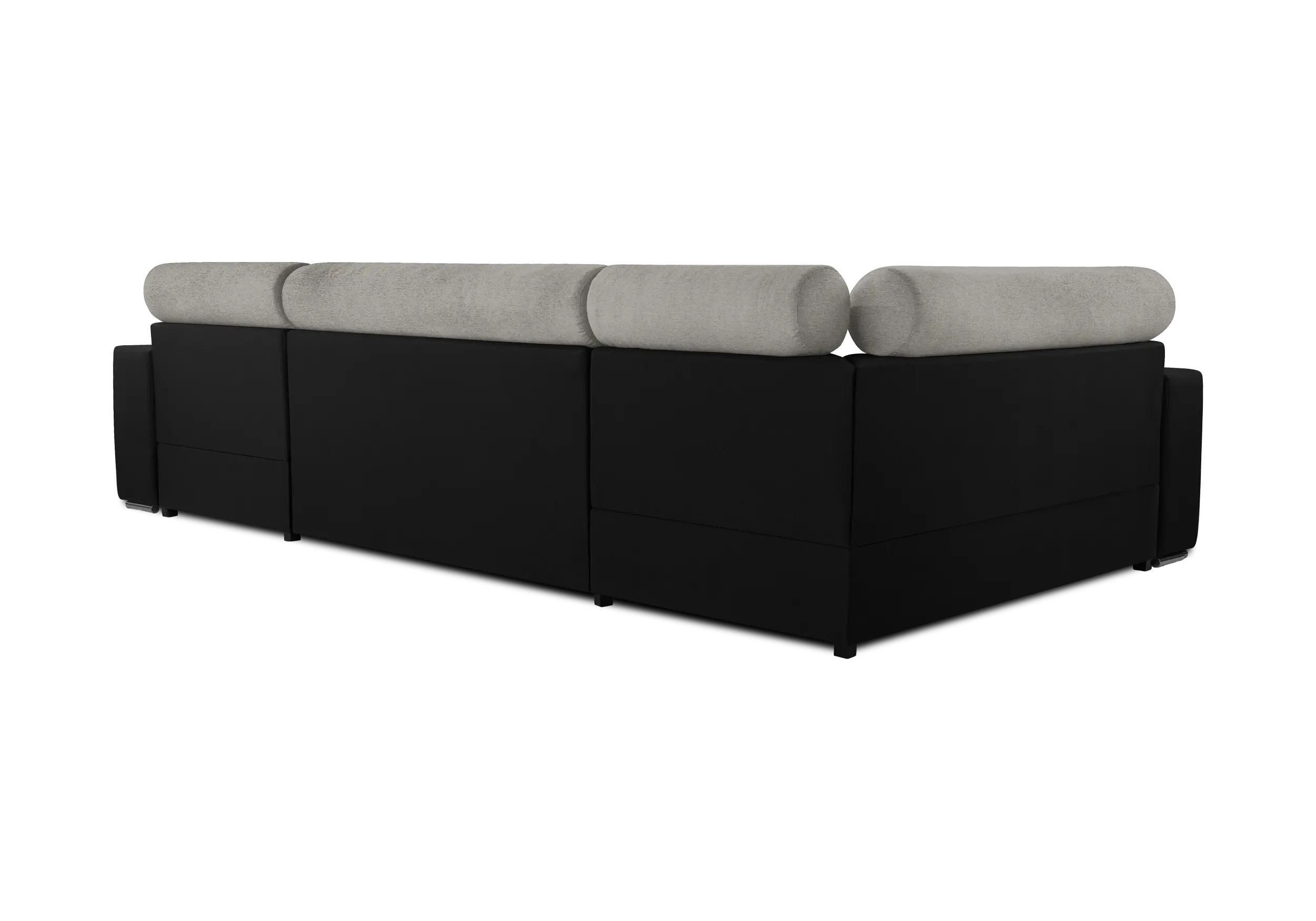 Tył obity jest materiałem pod kolor całości. Narożnik należy ustawić ok. 10cm od ściany, ponieważ przy otwieraniu poj. na pościel, oparcie odchyla się do tyłu.