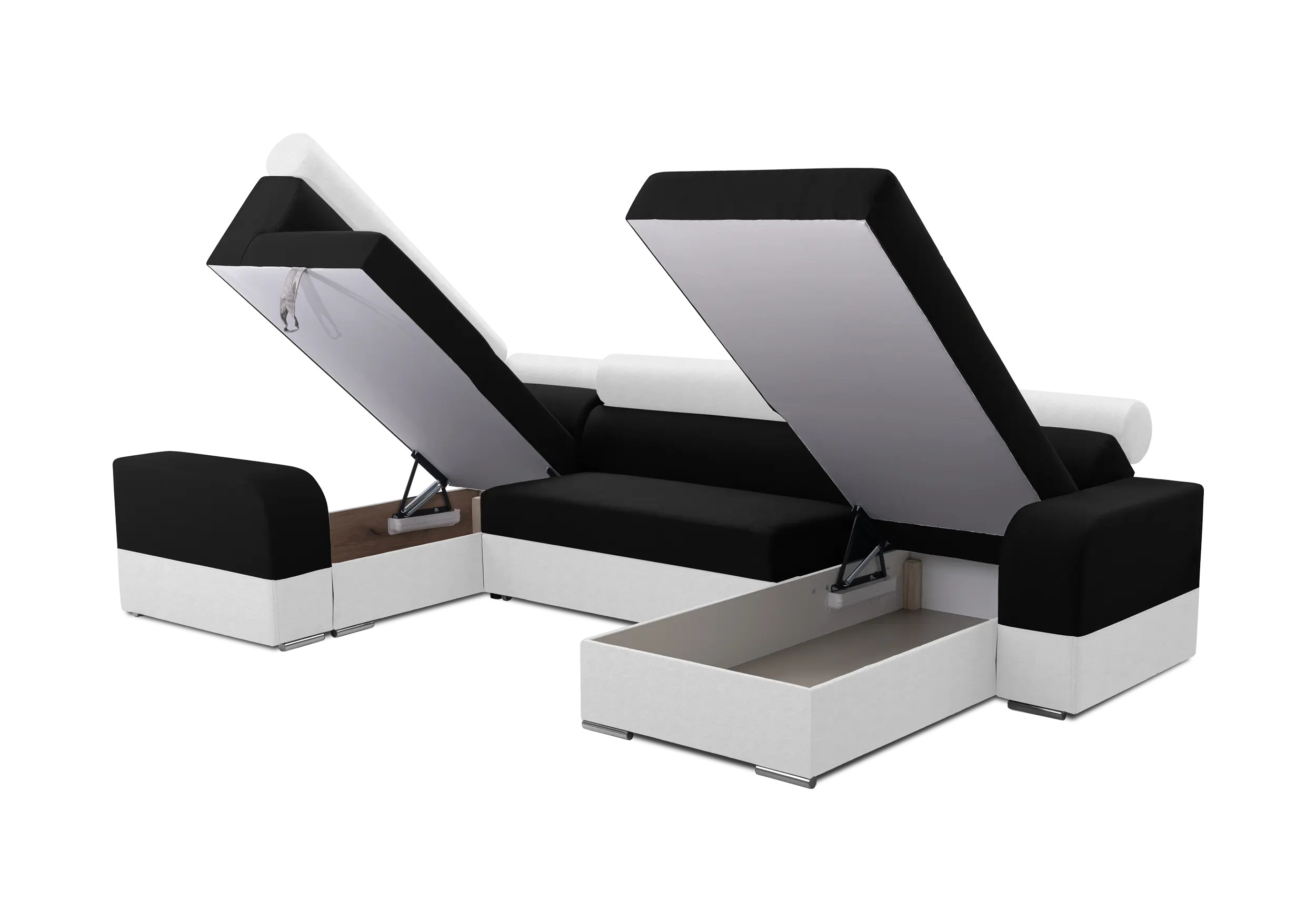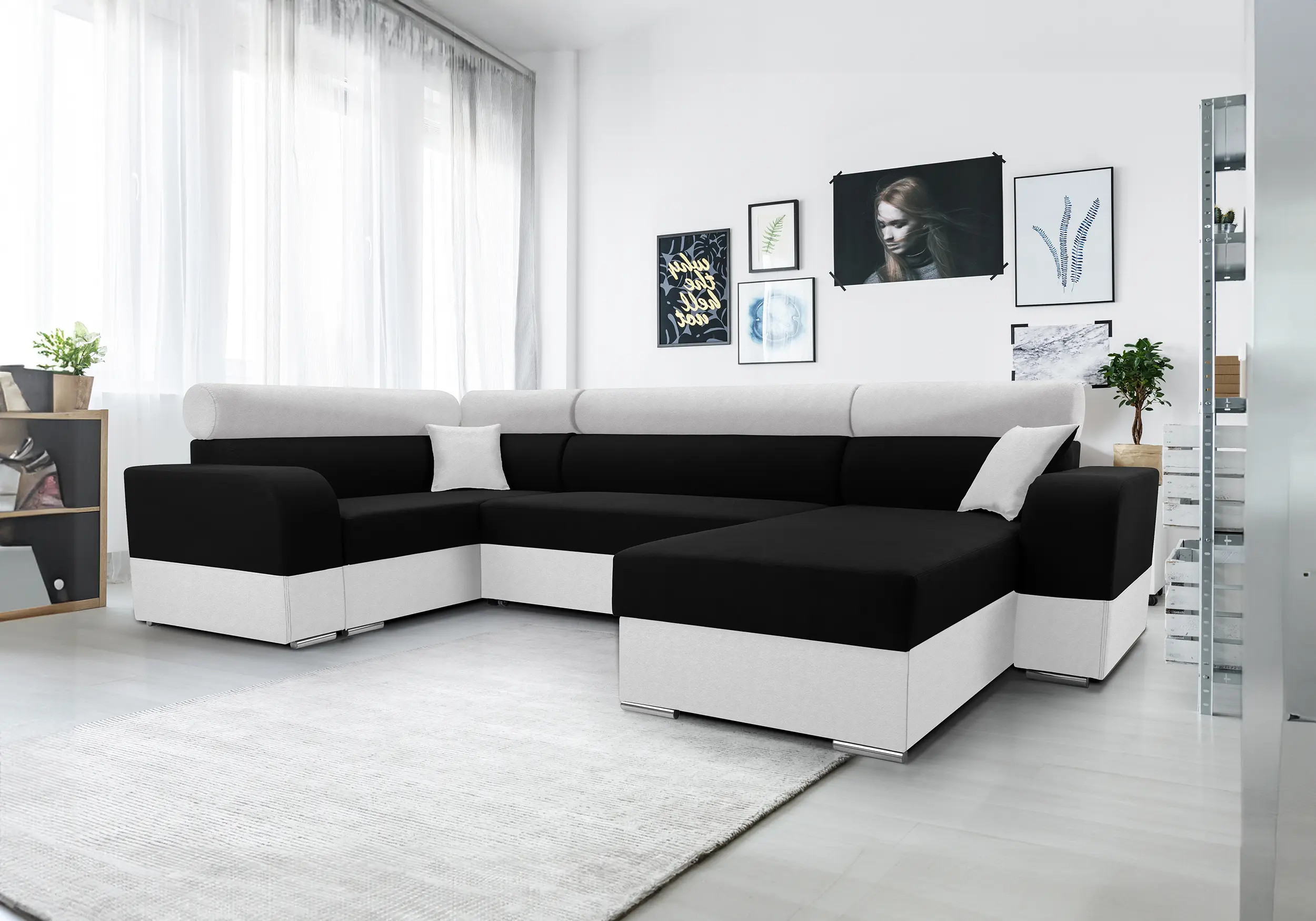 Narożnik Modern idealnie nadaje się zarówno do klasycznych jak i nowocześnie urządzonych wnętrz. Został stworzony na kształt litery „U”, dzięki czemu powierzchnia użytkowa jest naprawdę duż. Zagłówki i ozdobne małe poduszki dbają o maksymalny komfort użytkowania. Narożnik jest rozkładany, posiada powierzchnię spania 278x132cm oraz 2 pojemniki na pościel.