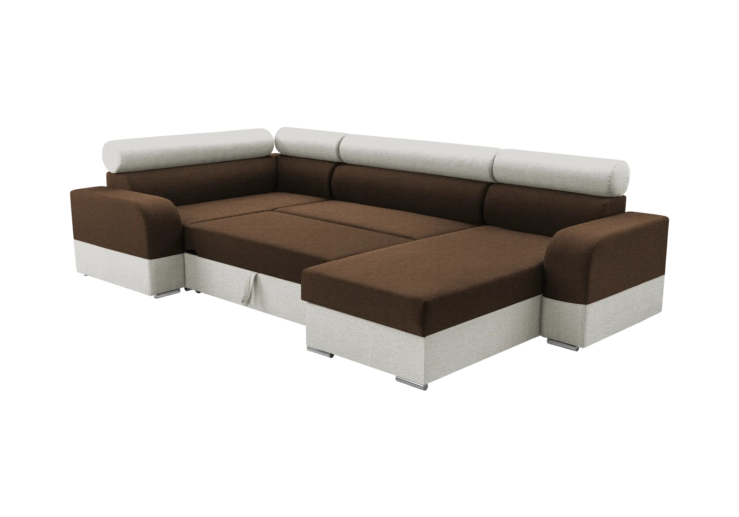 Narożnik Modern idealnie nadaje się zarówno do klasycznych jak i nowocześnie urządzonych wnętrz. Został stworzony na kształt litery „U”, dzięki czemu powierzchnia użytkowa jest naprawdę duż. Zagłówki i ozdobne małe poduszki dbają o maksymalny komfort użytkowania. Narożnik jest rozkładany, posiada powierzchnię spania 278x132cm oraz 2 pojemniki na pościel.