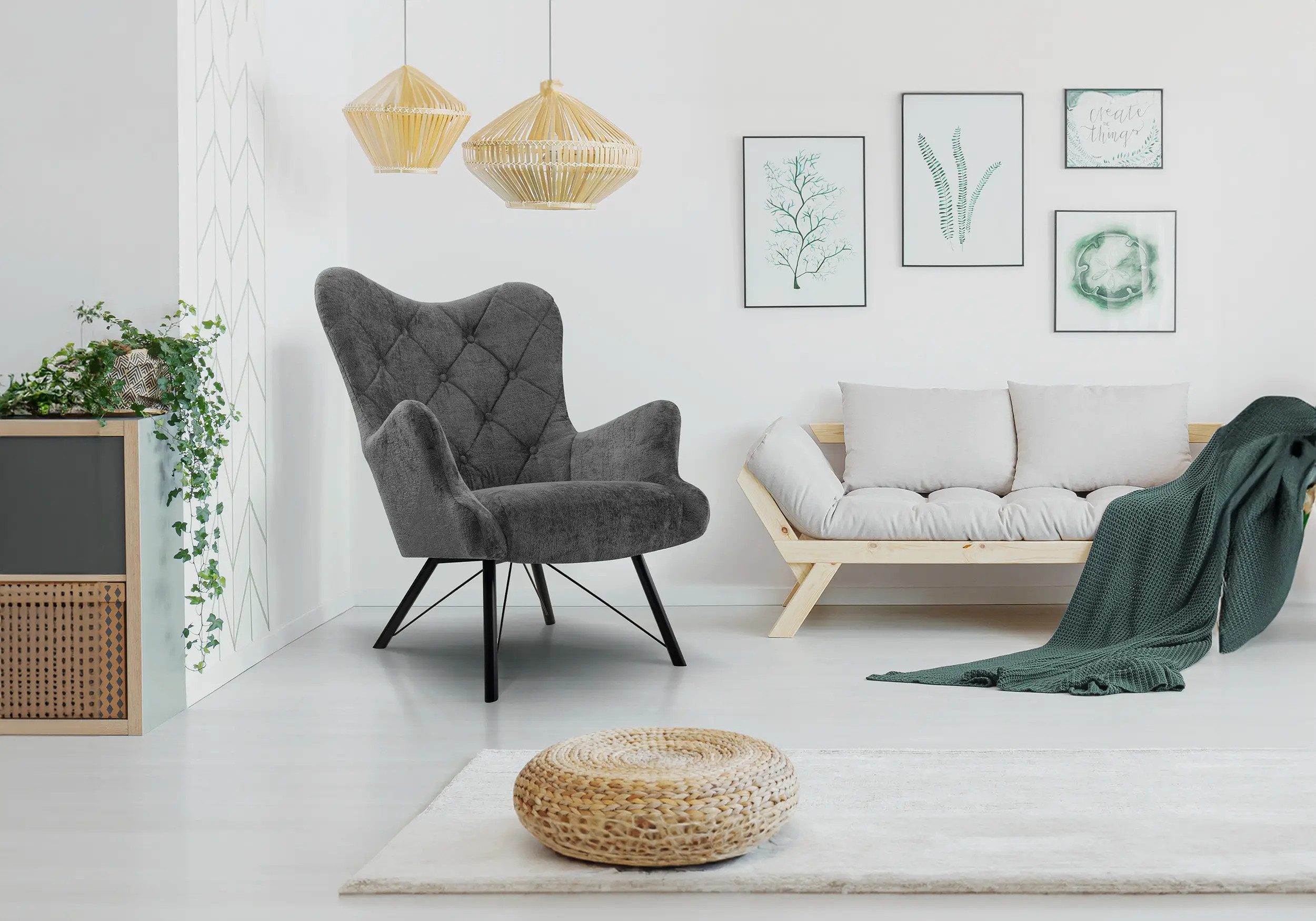 - Plecy fotela są tapicerowane materiałem w kolorze całości, dzięki czemu fotel może być meblem wolno stojącym (np. na środku salonu).