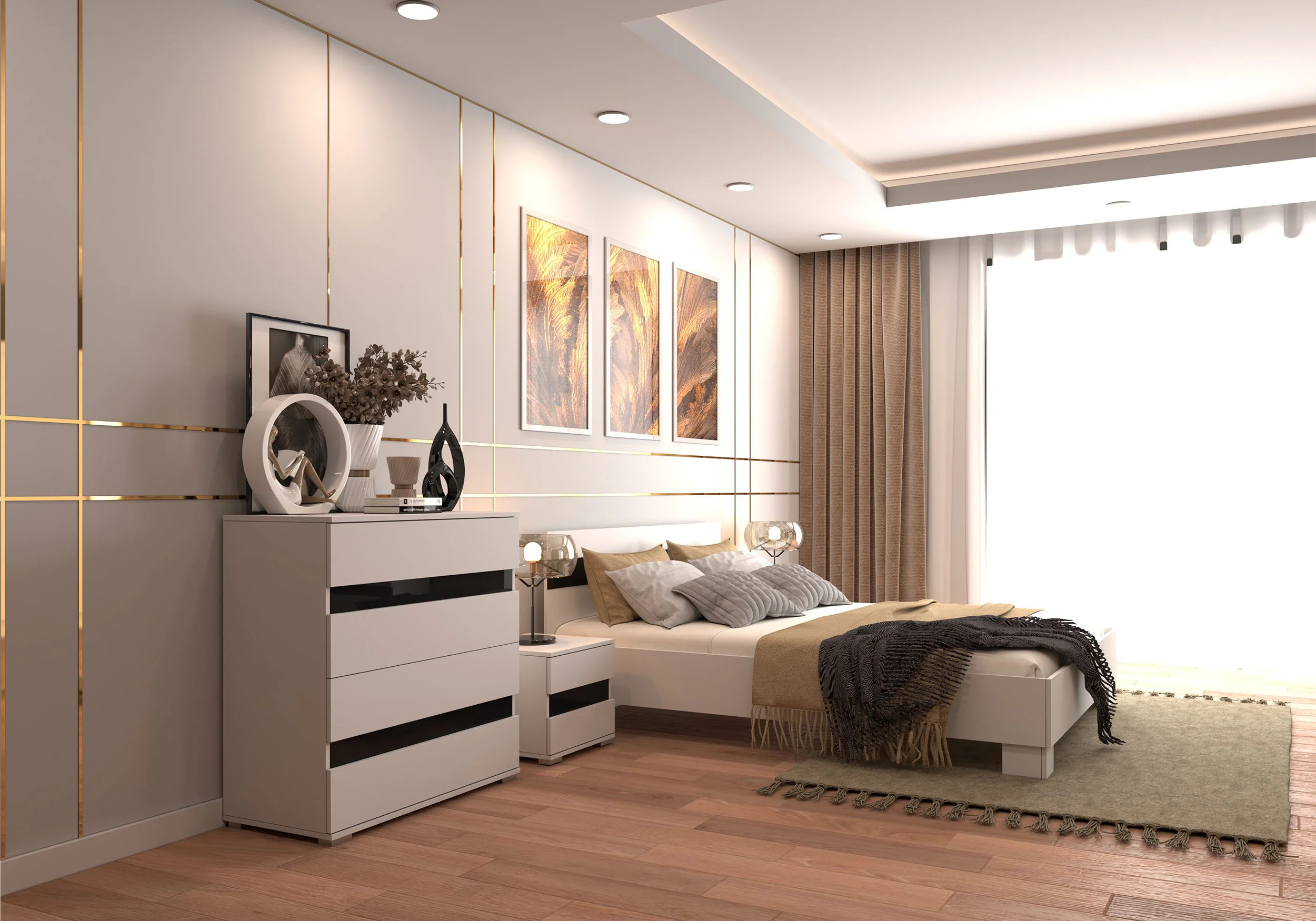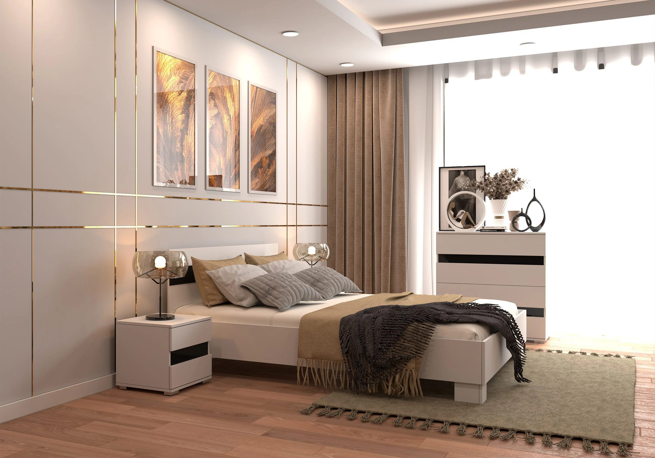 Łóżko Lucca z efektownym zagłówkiem ze wstawką z lakierowanego czarnego szkła to doskonała propozycja do każdej nowoczesnej sypialni. Solidne wykonanie to dodatkowy atut. Połączenie czarnego półpołysku oraz białego matu, nadaje wyszukanego wyglądu, który wpasuje się w aktualne trendy.