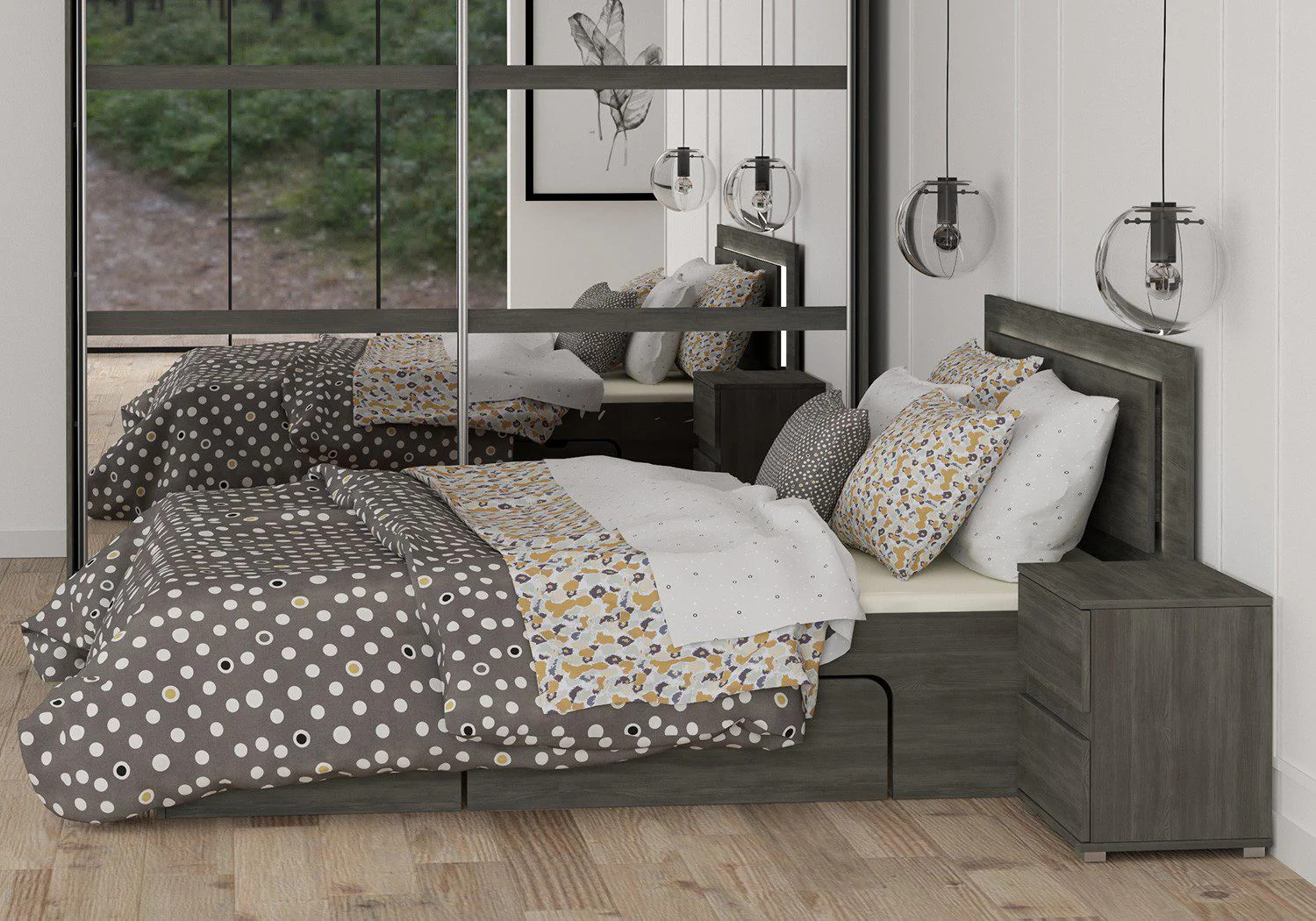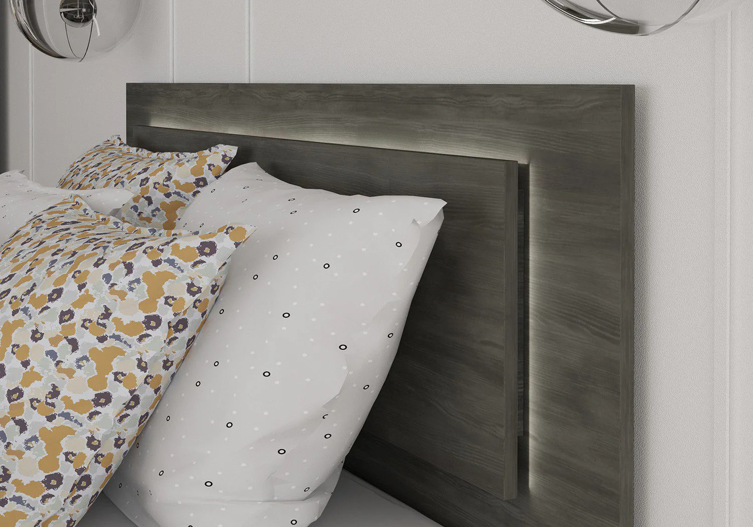 Łóżko Fabio o prostym stylu, z dekoracyjną drewnianą wstawką w zagłowiu łóżka z oświetleniem Led. Dodatkowym walorem łóżka jest szuflada na pościel. Schowek w bocznej części łóżka może służyć w dzień do przechowywania pościeli, a także w nocy do przechowania dekoracyjnego pledu. Istniej możliwość skomponowania sypialni z systemu Fabio oraz zakup łóżka z materacem 160x200cm.