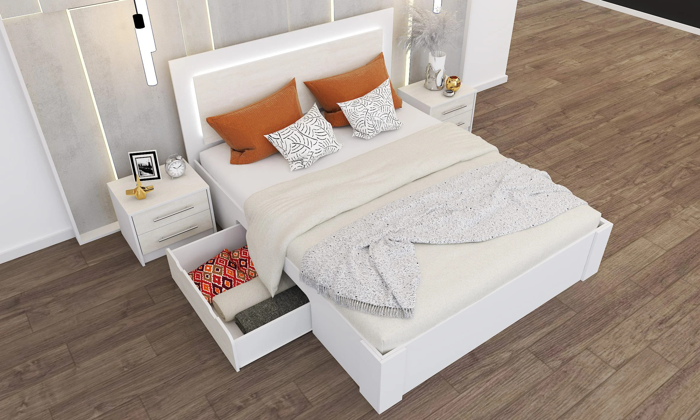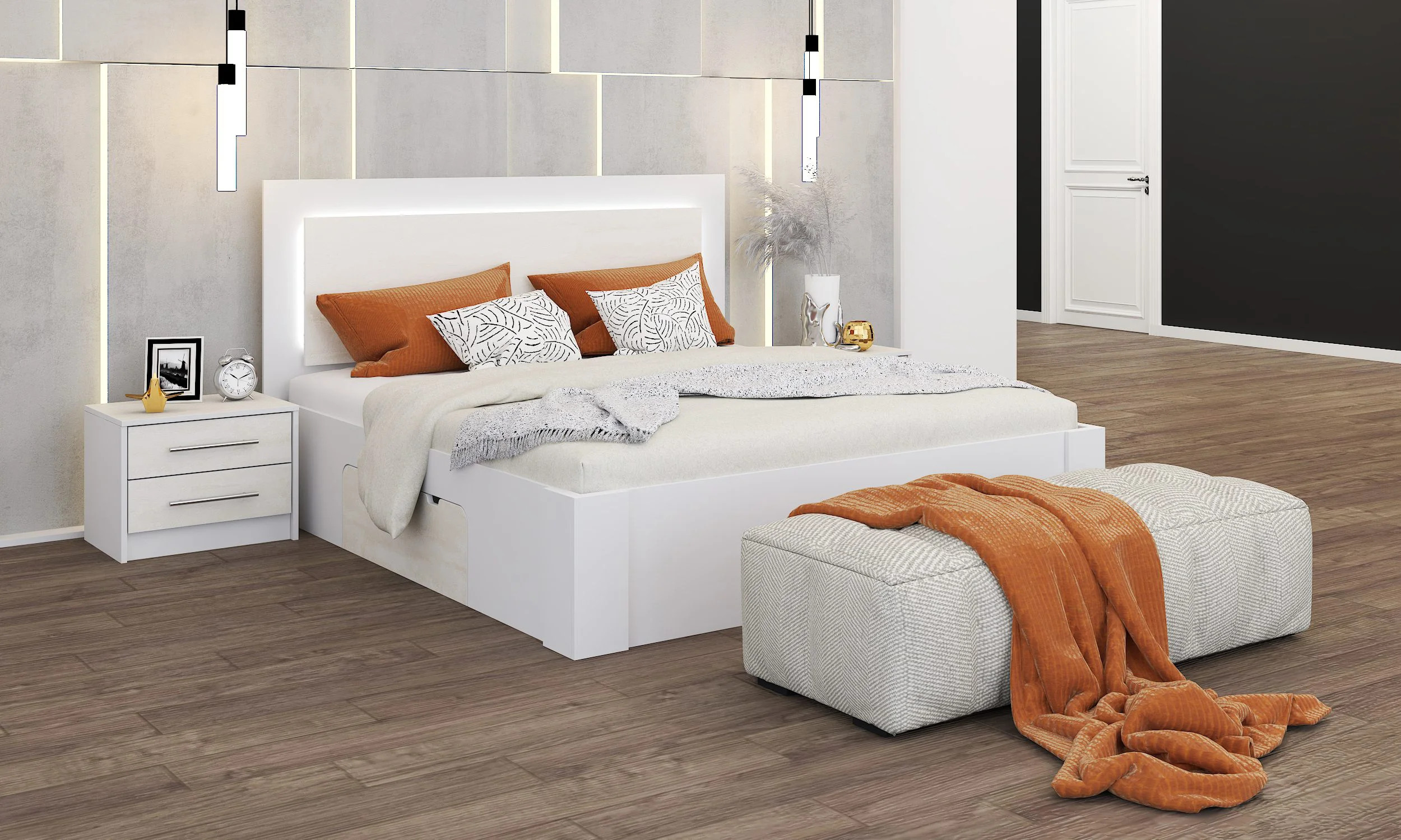 Łóżko Aurelia z efektownym zagłówkiem z zastosowanym oświetleniem LED charakteryzuje się solidnym wykonaniem oraz komfortem spania. Posiada głęboką szufladę na pościel co gwarantuje wygodne użytkowanie. Istnieje możliwość zakupu łóżka z materacem 160x200cm. Dodatkowo łóżko można wyposażyć w dodatkowe meble z serii Aurelia, tworząc świetne miejsce do przechowywania w sypialni.
