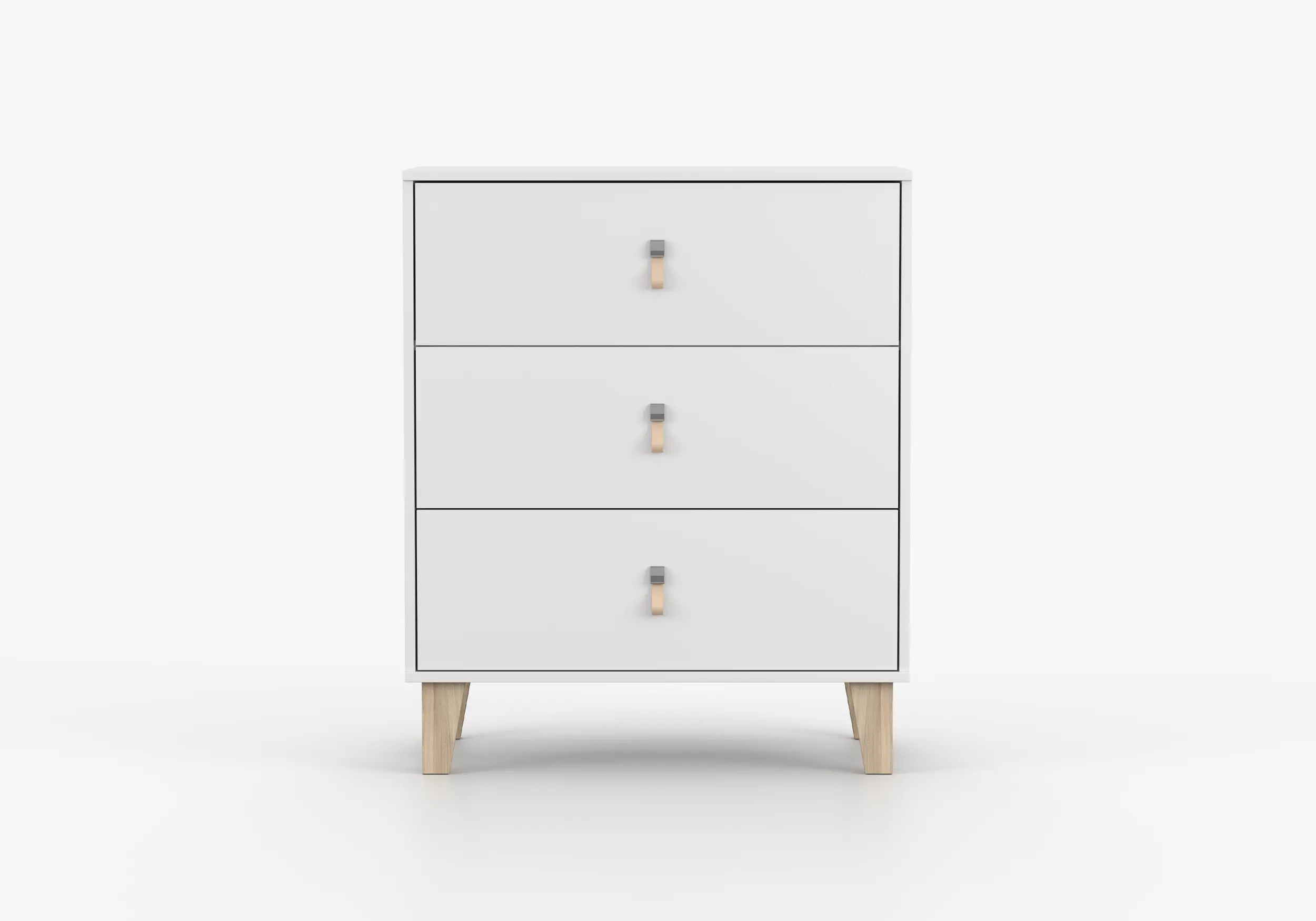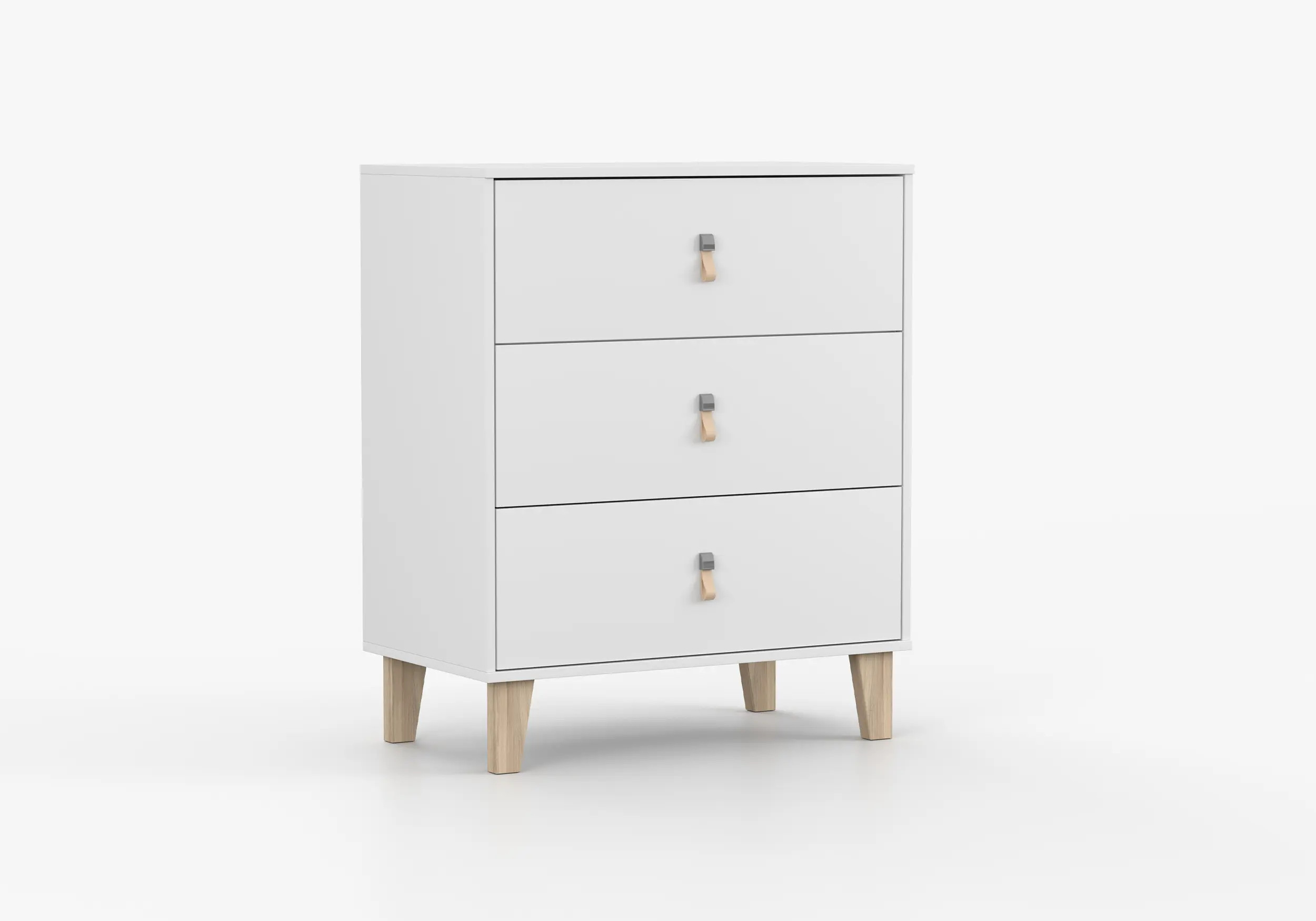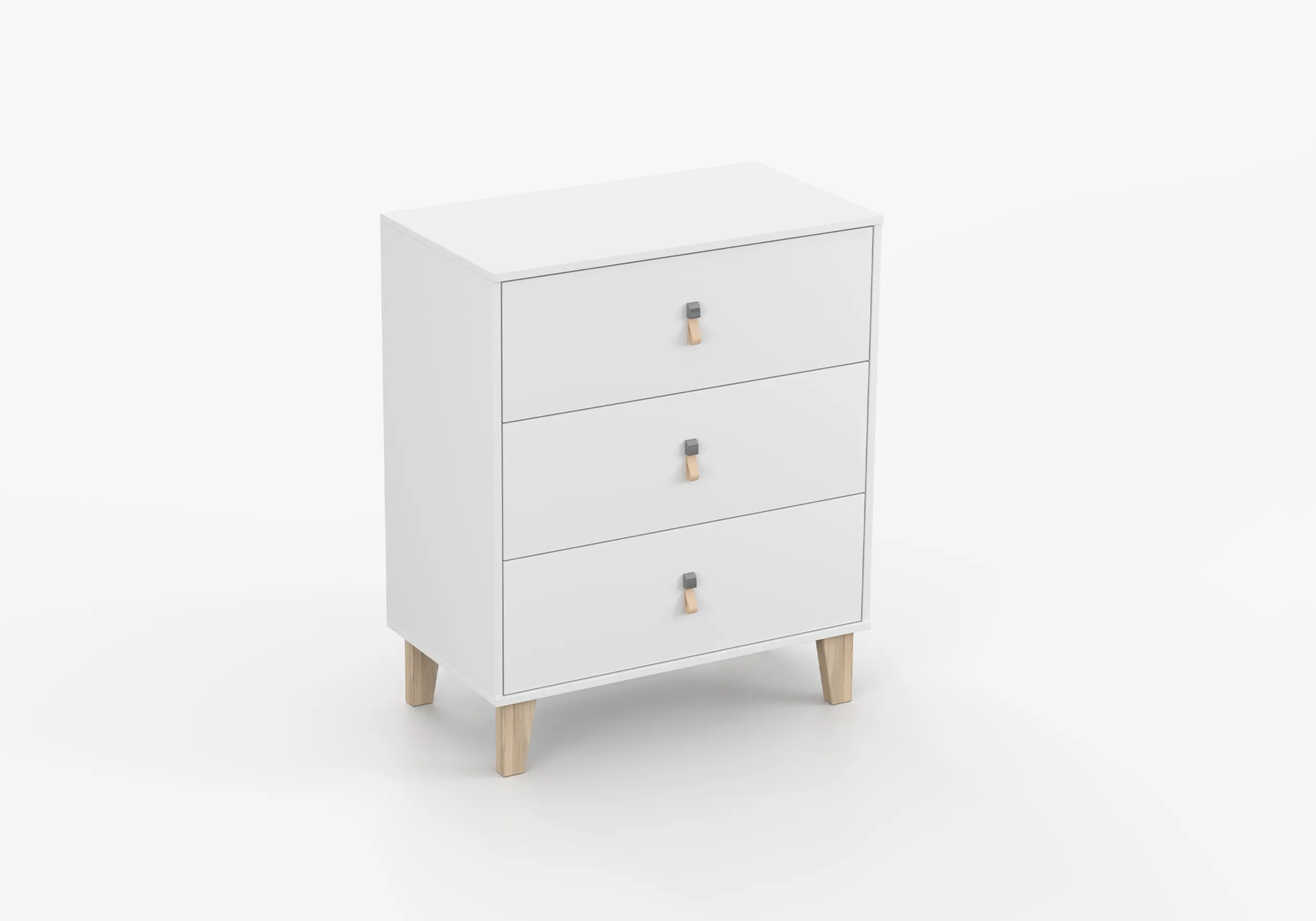 Komoda Figo łączy nowoczesny skandynawski styl z funkcjonalnością oraz komfortem codziennego użytkowania. Wyposażona jest w trzy pojemne szuflady, dzięki którym zorganizujesz i uporządkujesz przestrzeń w pokoju dziecka. Niepozornym, aczkolwiek bardzo istotnym elementem mebla są skórzane uchwyty, które dodają ciepła, nadając meblu charakter i naturalny wygląd.